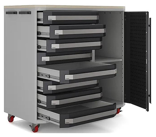 Тумба Кобор Expert TTL/2-100/64 2S.80B предназначена для хранения и транспортировки к рабочему месту инструментов и приборов, необходимых для работы на сервисных и слесарных участках, в цехах заводов и на промышленных предприятиях. Модель оснащена ложементом с прорезиненными бортиками, распашной дверью, 2 полками и 8 выдвижными ящиками, которые гарантируют комфортное использование и позволяют хранить необходимые инструменты и материалы на рабочем месте. Тумба имеет 4 поворотных колеса, обеспечивающих легкое перемещение по производственной зоне и стабильную фиксацию на месте. Корпус выполнен из металла с порошковым покрытием, устойчивым к механическим и химическим воздействиям. Особенности: