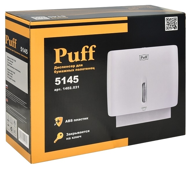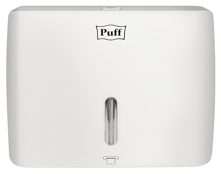 Диспенсер Puff 5145 предназначен для размещения и дозированной подачи бумажных полотенец в общественных санитарных узлах гостиниц, предприятий общественного питания, медицинских учреждений и других мест массового пребывания. Модель оснащена запираемой на ключ откидной крышкой. Корпус прямоугольно ориентированной формы изготовлен из ударопрочного АБС-пластика, крышка с белой матовой поверхностью, упаковка – картонная коробка. Комплектация: