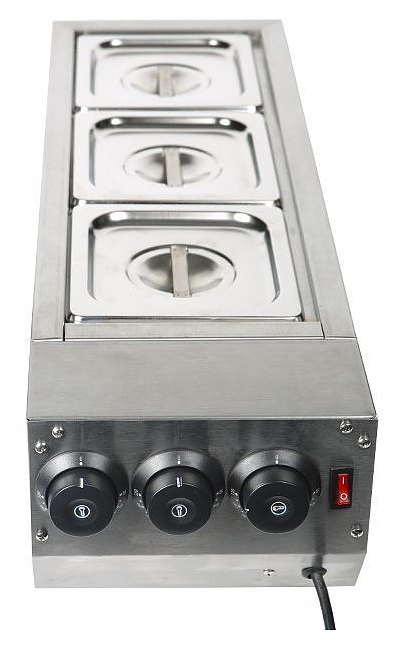 Подогреватель EKSI HW-23 рст используется на предприятиях общественного питания и торговли для темперирования и поддержания в горячем виде шоколада и соусов. Модель оснащена электромеханической панелью управления, 3 емкостями для работы с различными видами шоколада одновременно, 3 ТЭНами, 3 термостами независимой регулировки температуры и керамическими подогревателями. Корпус выполнен из нержавеющей стали. В комплект поставки входят 3 GN 1/6 глубиной 100 мм с крышками. Дополнительные характеристики: