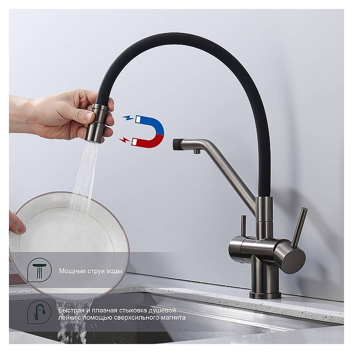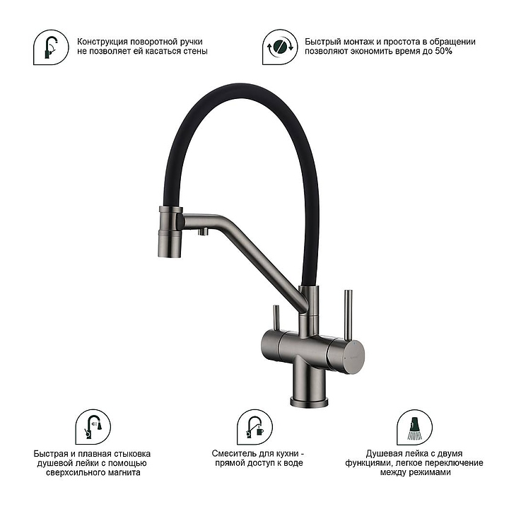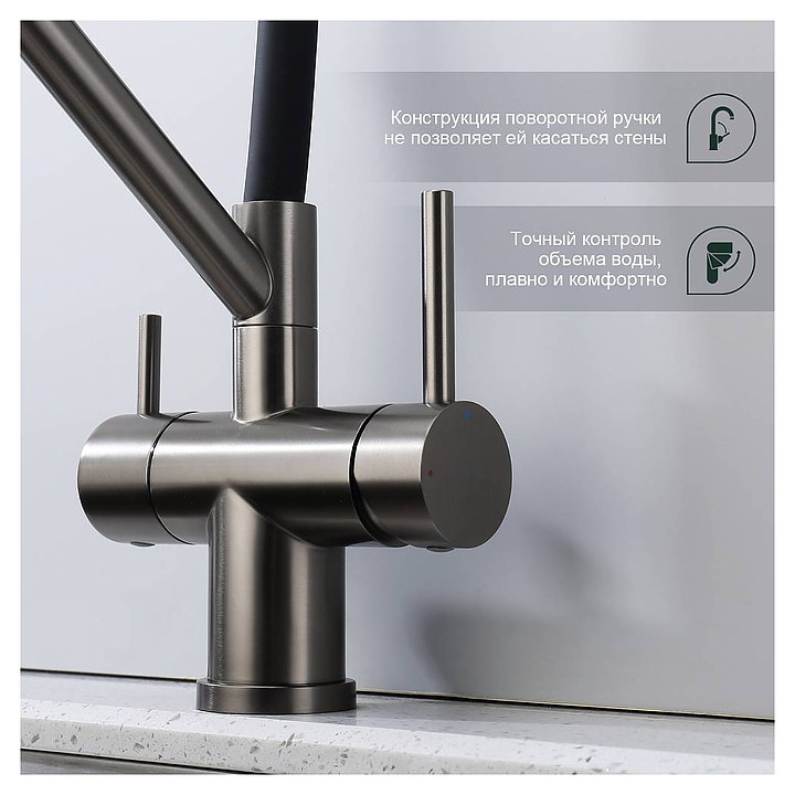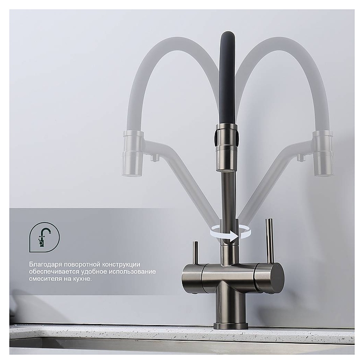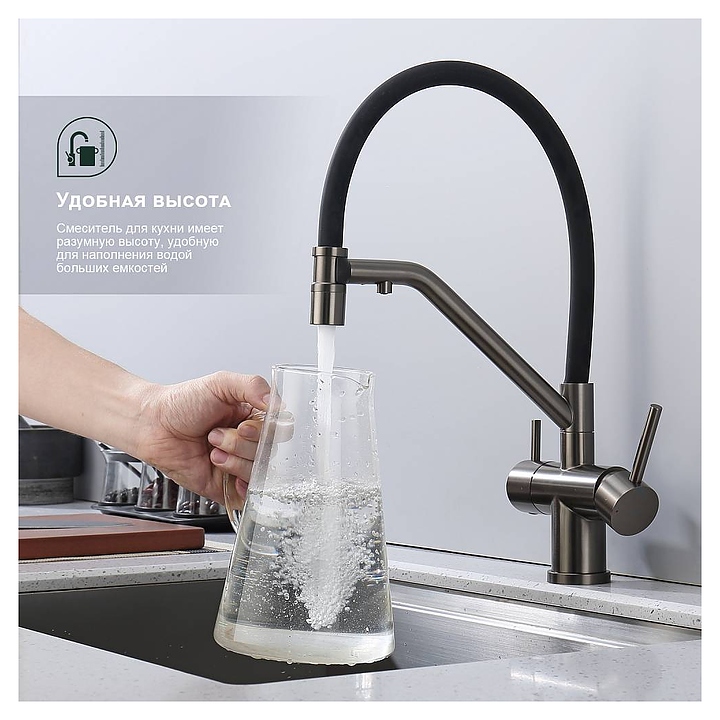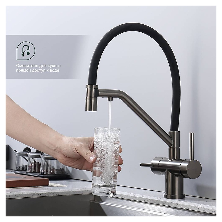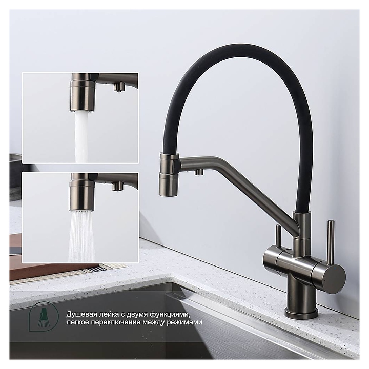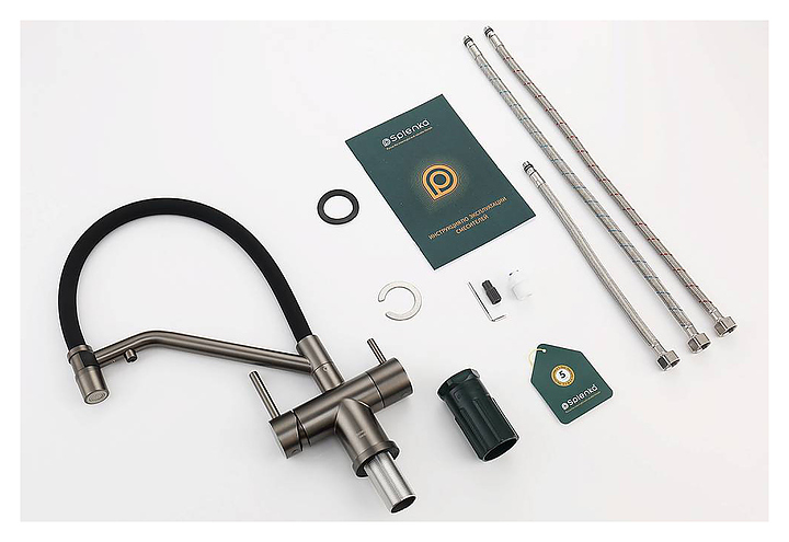 Смеситель Splenka S70.62.09 предназначен для подачи горячей и холодной воды в кухонных помещениях. Модель оснащена гибким изливом, встроенным краном для питьевой воды и керамическим картриджем, обеспечивающим плавный ход рычага смесителя, контроль и точность при выборе напора и температуры воды. Аэратор создает мягкую струю без брызг и снижает шум. Изделие выполнено из нержавеющей стали, которая отличается прочностью и долговечностью, излив - из пищевого силикона, картридж - из керамики. В комплект поставки входят гибкая подводка и крепления. Особенности: