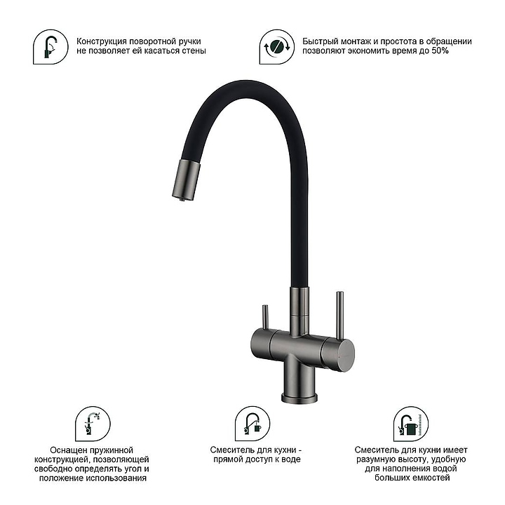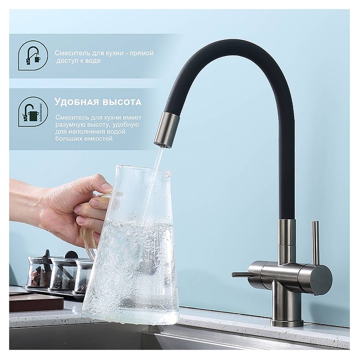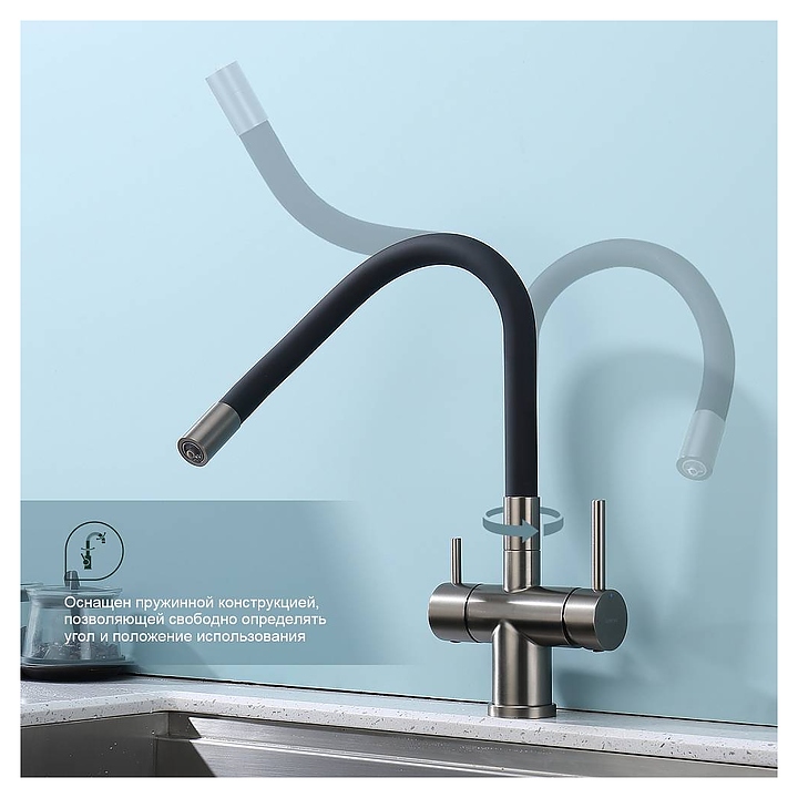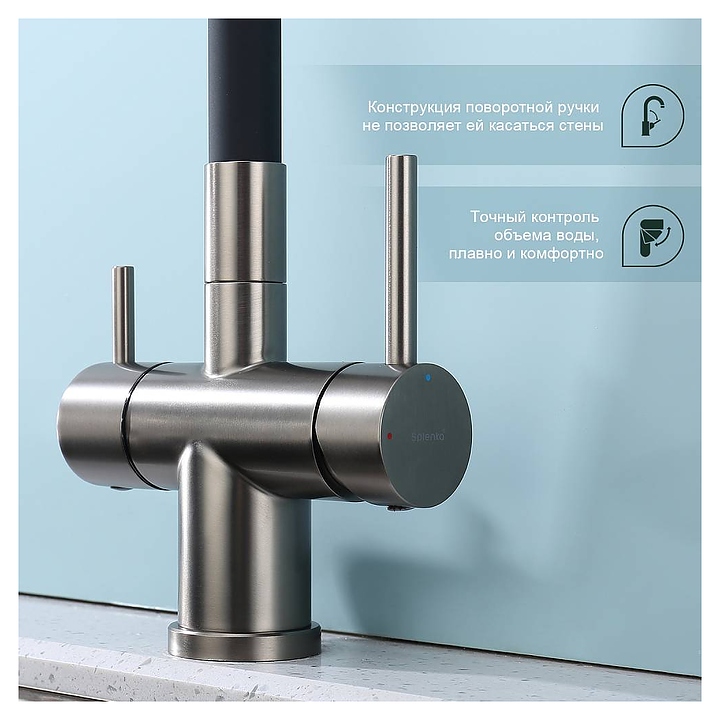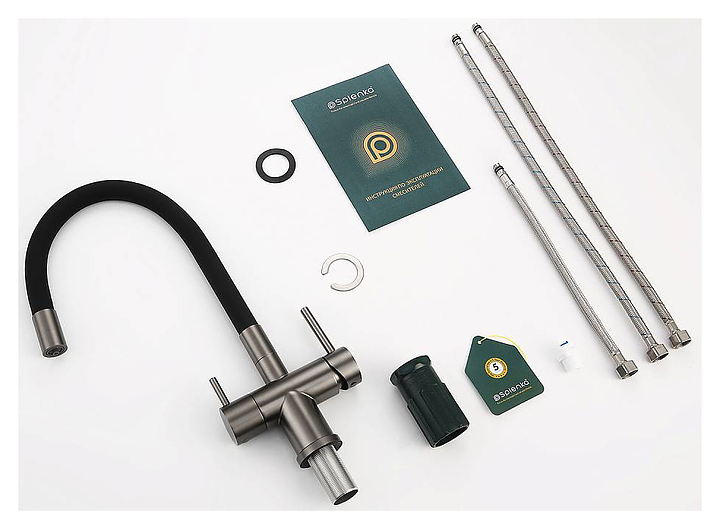 Смеситель Splenka S70.64.09 предназначен для подачи горячей и холодной воды в кухонных помещениях. Модель оснащена гибким изливом, встроенным фильтром для питьевой воды и керамическим картриджем, обеспечивающим плавный ход рычага смесителя, контроль и точность при выборе напора и температуры воды. Аэратор создает мягкую струю без брызг и снижает шум. Изделие выполнено из нержавеющей стали, которая отличается прочностью и долговечностью. В комплект поставки входят подводка и крепления. Особенности: