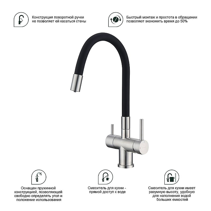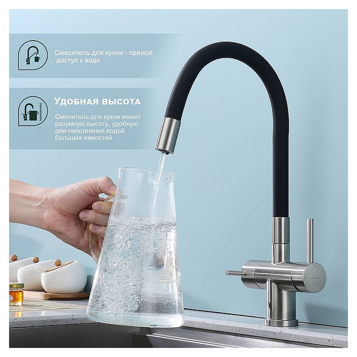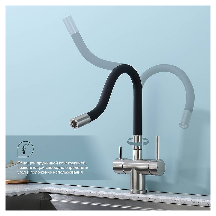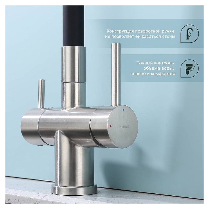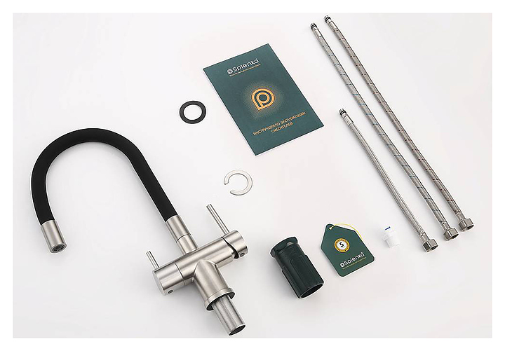 Смеситель Splenka S70.64.05 предназначен для подачи горячей и холодной воды в кухонных помещениях. Модель оснащена гибким изливом, встроенным фильтром для питьевой воды и керамическим картриджем, обеспечивающим плавный ход рычага смесителя, контроль и точность при выборе напора и температуры воды. Аэратор создает мягкую струю без брызг и снижает шум. Изделие выполнено из нержавеющей стали, которая отличается прочностью и долговечностью. В комплект поставки входят подводка и крепления. Особенности: