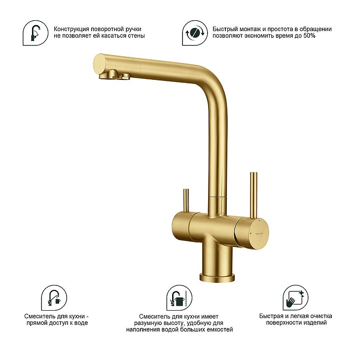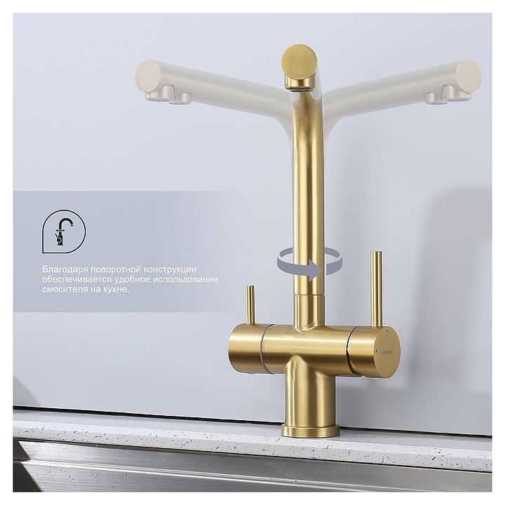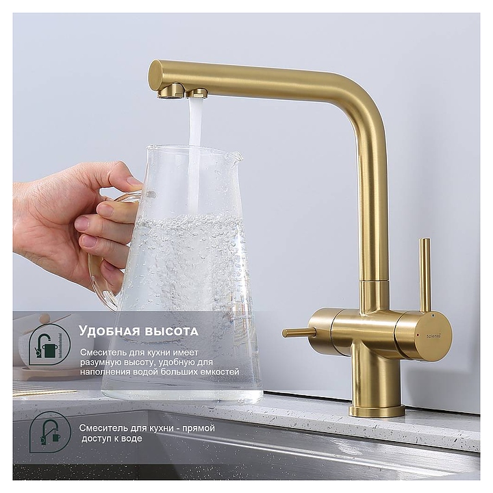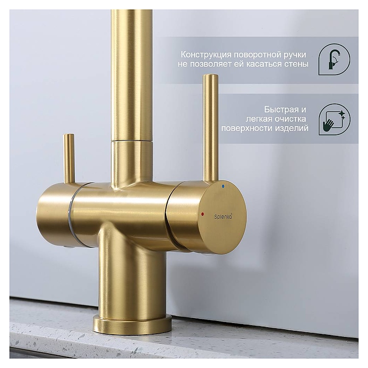 Смеситель Splenka S70.61.03 предназначен для подачи горячей и холодной воды в кухонных помещениях. Модель оснащена встроенным фильтром для питьевой воды и керамическим картриджем, обеспечивающим плавный ход рычага смесителя, контроль и точность при выборе напора и температуры воды. Аэратор создает мягкую струю без брызг и снижает шум. Изделие выполнено из нержавеющей стали, которая отличается прочностью и долговечностью. В комплект поставки входят подводка и крепления. Особенности: