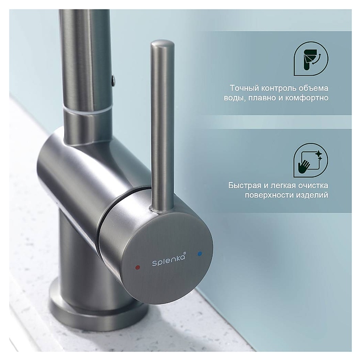 Смеситель Splenka S205.40.09 предназначен для подачи горячей и холодной воды в кухонных помещениях. Модель оснащена керамическим картриджем, обеспечивающим плавный ход рычага смесителя, контроль и точность при выборе напора и температуры воды. Аэратор создает мягкую струю без брызг и снижает шум. Изделие выполнено из нержавеющей стали, которая отличается прочностью и долговечностью. В комплект поставки входят подводка и крепления. Особенности: