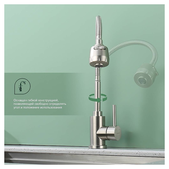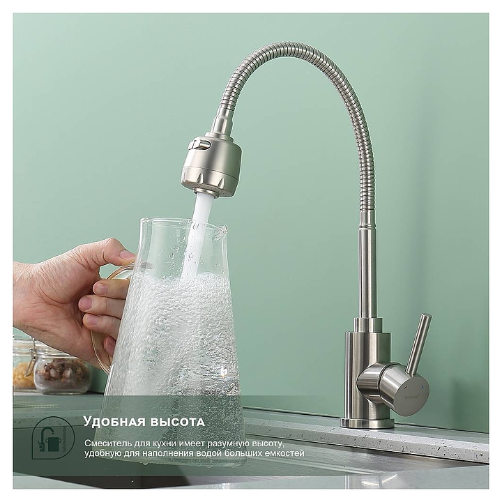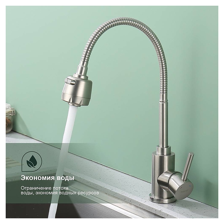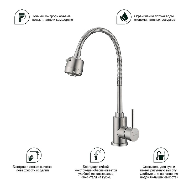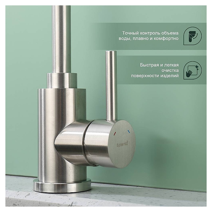 Смеситель Splenka S201.47.05 предназначен для подачи горячей и холодной воды в кухонных помещениях. Модель оснащена гибким изливом и керамическим картриджем, обеспечивающим плавный ход рычага смесителя, контроль и точность при выборе напора и температуры воды. Аэратор создает мягкую струю без брызг и снижает шум. Изделие выполнено из нержавеющей стали, которая отличается прочностью и долговечностью. В комплект поставки входят подводка и крепления. Особенности: