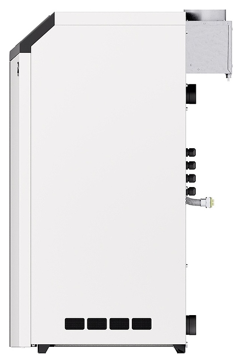 Распашная фронтальная дверь с магнитным фиксатором, легкосъемные боковая панель и верхняя крышка с клипсовым креплением, съемные крышки дымосборника для удобства технического обслуживания и очистки без необходимости отсоединения дымохода