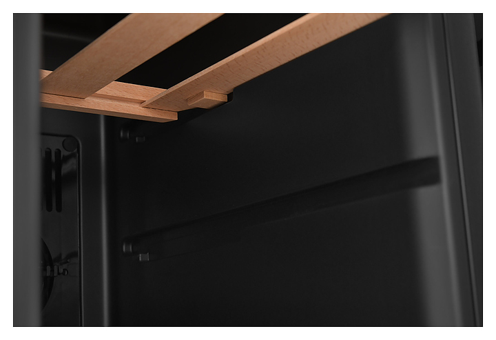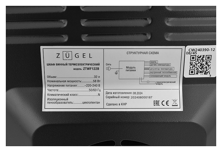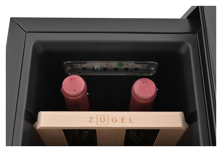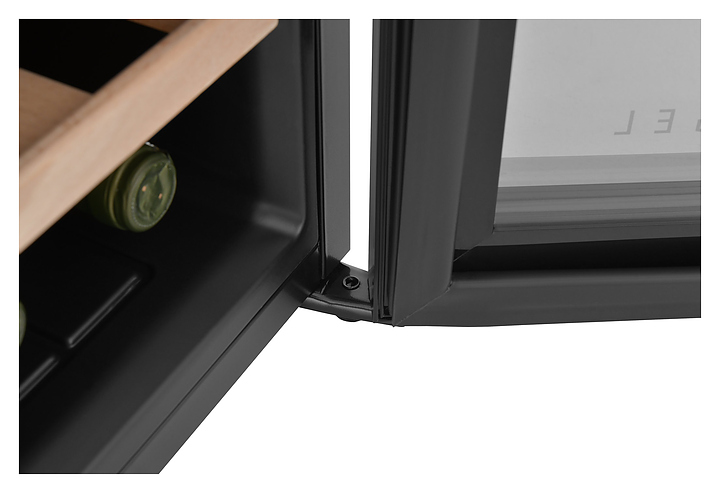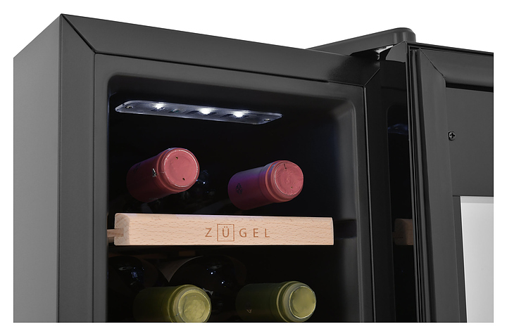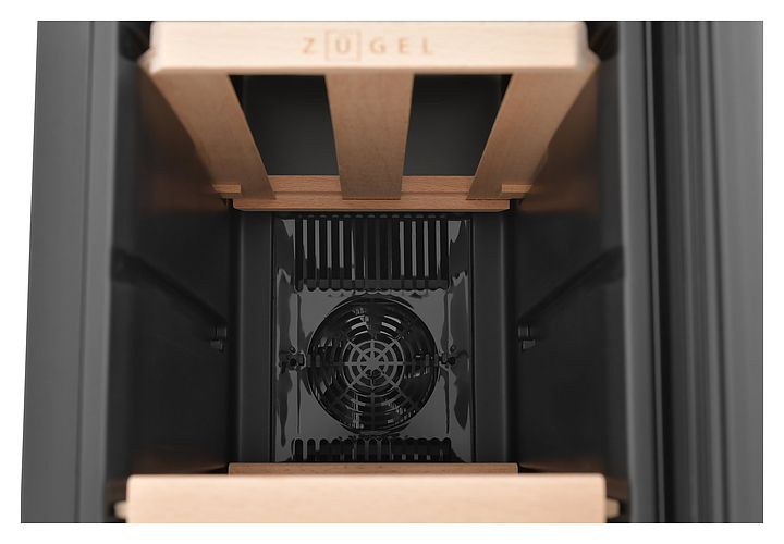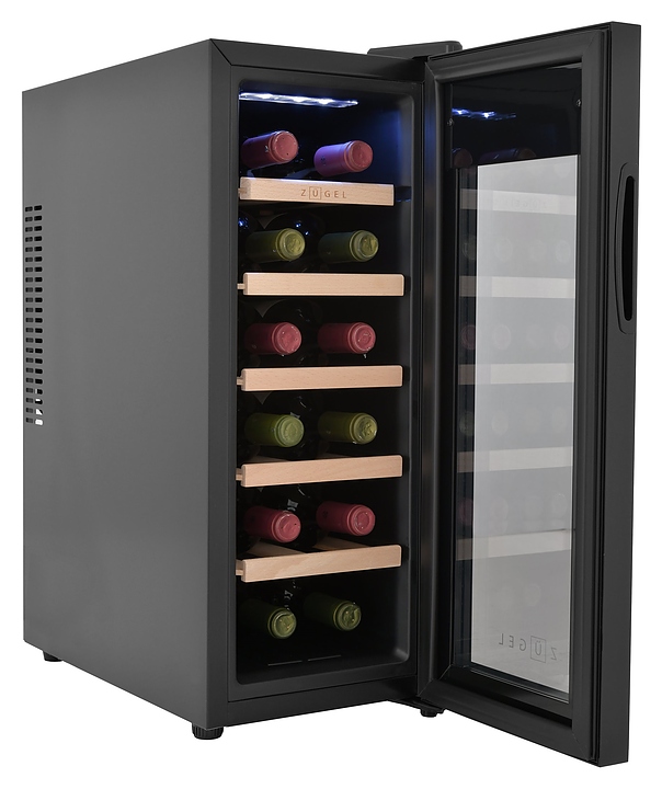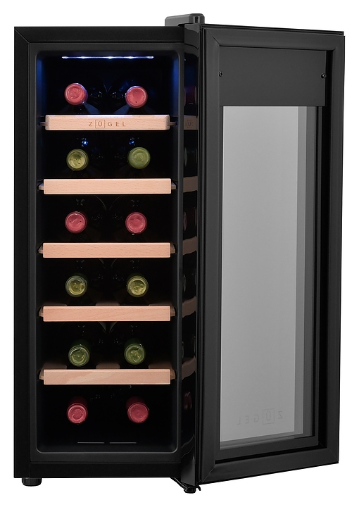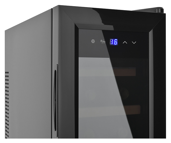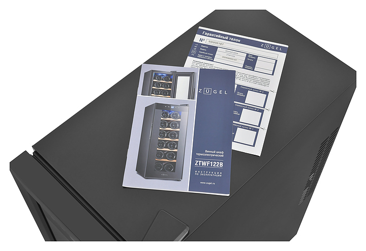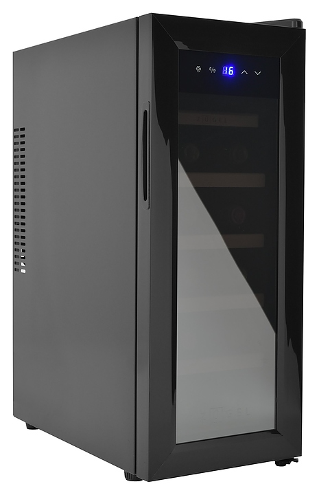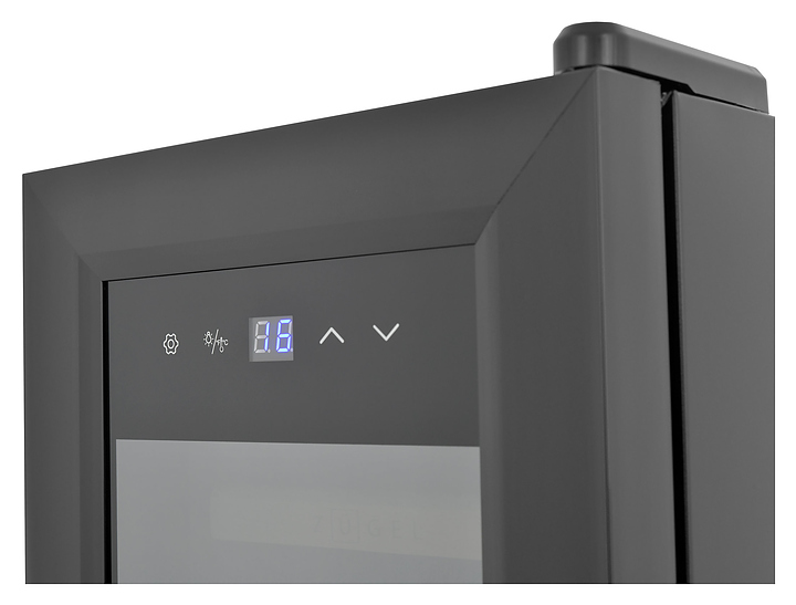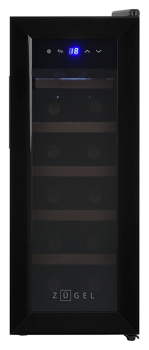 Винный шкаф Zugel ZTWF122B предназначен для хранения при оптимальных условиях бутилированного вина различных сортов в барах, ресторанах, специализированных магазинах, подсобных складских помещениях, а также домашних условиях. Модель оснащена монотемпературной холодильной камерой с интегрированными направляющими для полок, правосторонней распашной дверью с обзорным остеклением, кабелем питания, расположенной на фасаде двери электронной панелью управления с сенсорными функциональными клавишами и цифровым жидкокристаллическим дисплеем с голубой подсветкой индикации. Корпус выполнен из металла с матовым покрытием черного цвета, рама двери и внутренняя облицовка камеры черного цвета, остекление – из тонированного закаленного стекла, полки – из массива буковой древесины с фронтальной гравировкой логатипа. В комплект поставки входят 5 съемных полок с направляющими для размещения бутылок, инструкция по эксплуатации, гарантийный талон и заводская упаковка. Особенности: