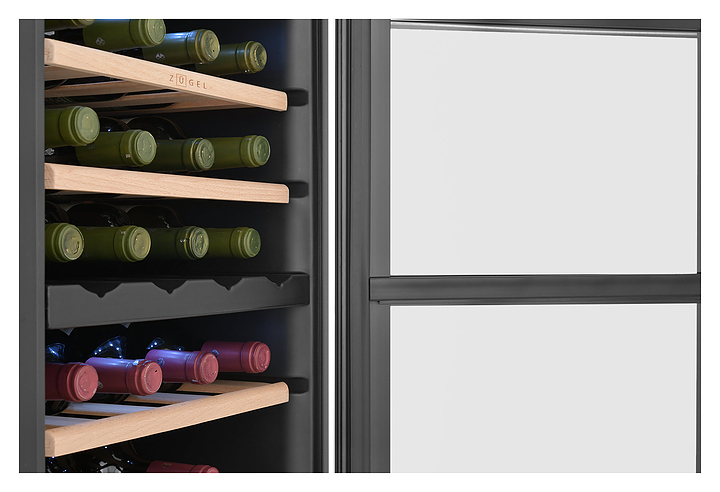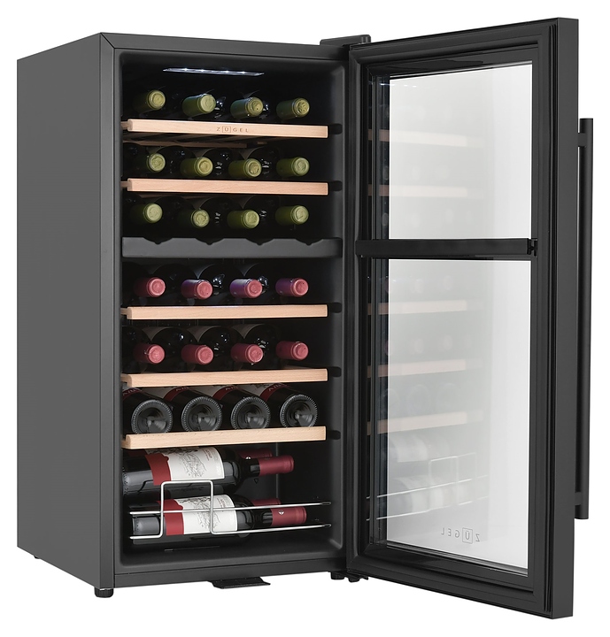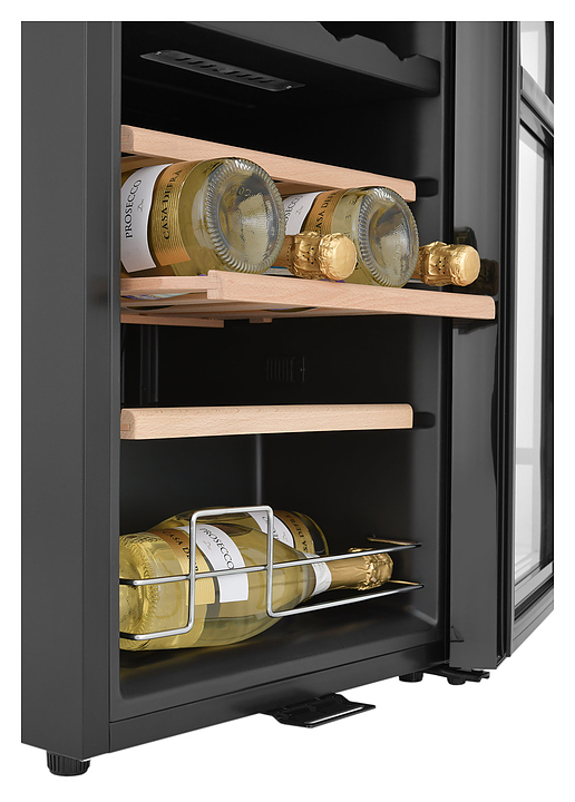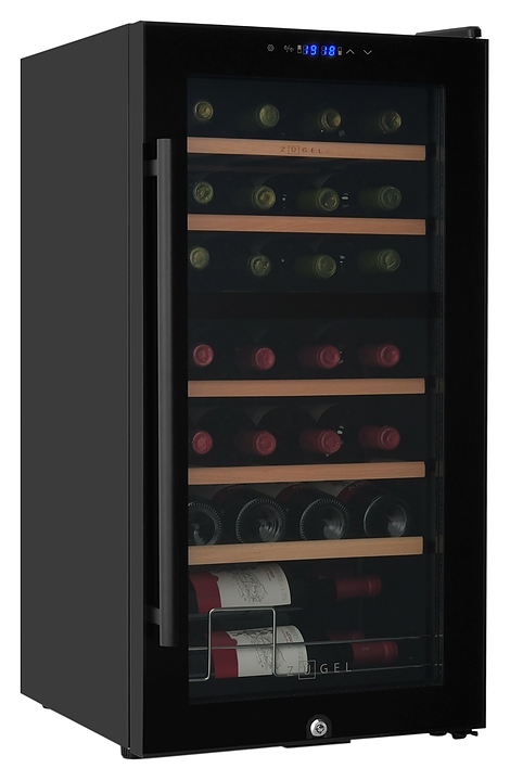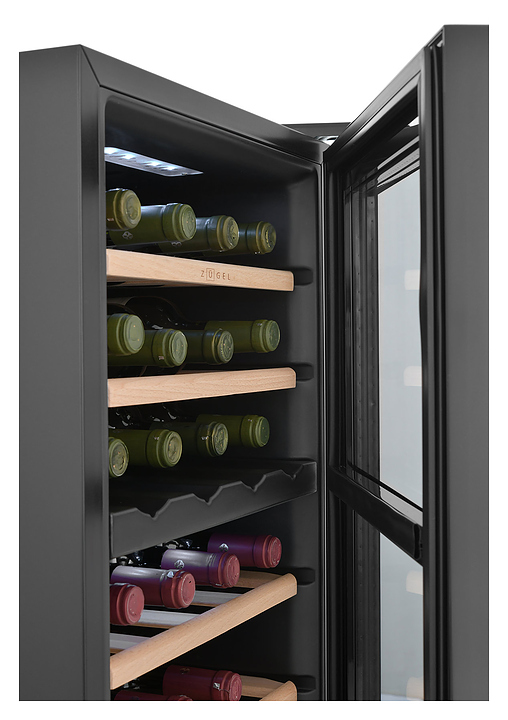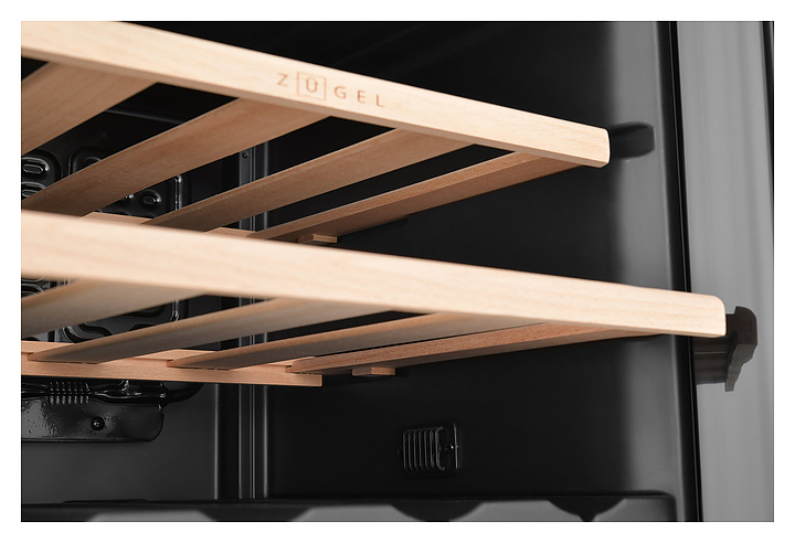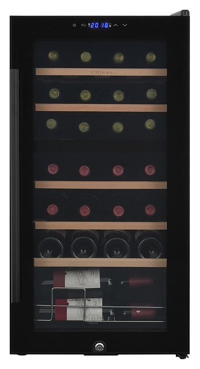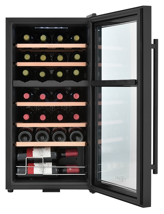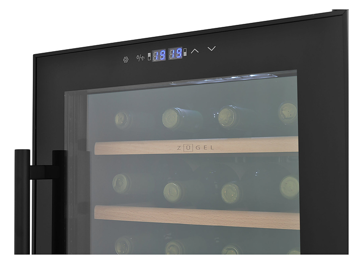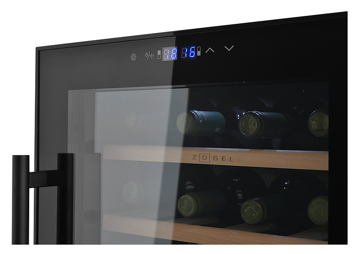 Винный шкаф Zugel ZCWF281DB предназначен для хранения при оптимальных условиях бутилированного вина различных сортов в барах, ресторанах, специализированных магазинах, подсобных складских помещениях, а также домашних условиях. Модель оснащена холодильной камерой c 2 температурными зонамии, интегрированными направляющими для полок, правосторонней распашной дверью с длинной трубчатой вертикальной рукояткой и обзорным остеклением, кабелем питания, расположенной на фасаде двери электронной панелью управления с сенсорными функциональными клавишами и цифровым жидкокристаллическим дисплеем с голубой подсветкой индикации. Корпус и рукоятка выполнены из металла с матовым антикоррозийным покрытием черного цвета, дверь с полным фронтальным остеклением без винтового крепежа, рама двери и внутренняя облицовка камеры черного цвета, остекление – из тонированного закаленного стекла, стандартные полки – из массива буковой древесины с фронтальной гравировкой логатипа, витринная полка – из металла. В комплект поставки входят 5 съемных стандартных полок с направляющими для размещения бутылок, витринная полка, комплект ключейк замку, инструкция по эксплуатации, гарантийный талон и заводская упаковка. Особенности:
