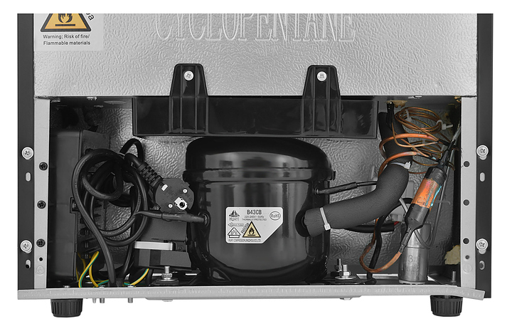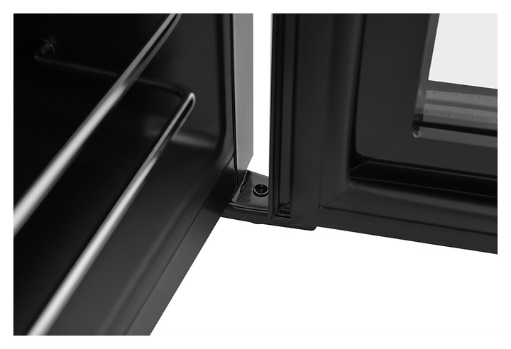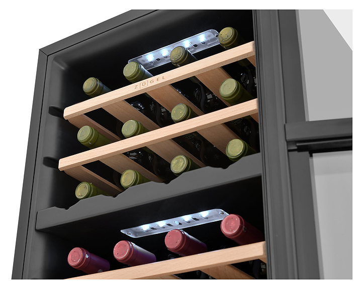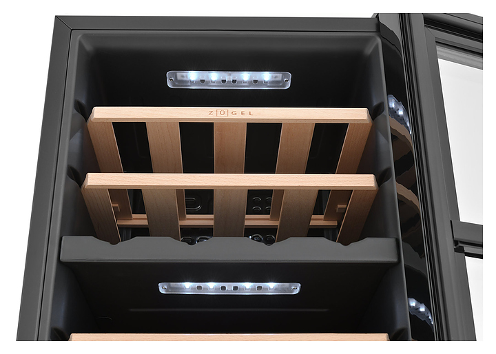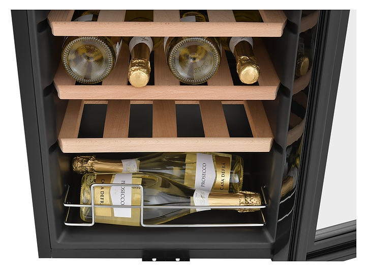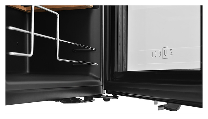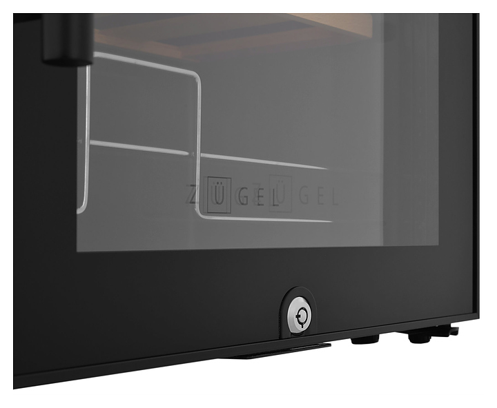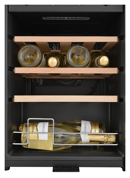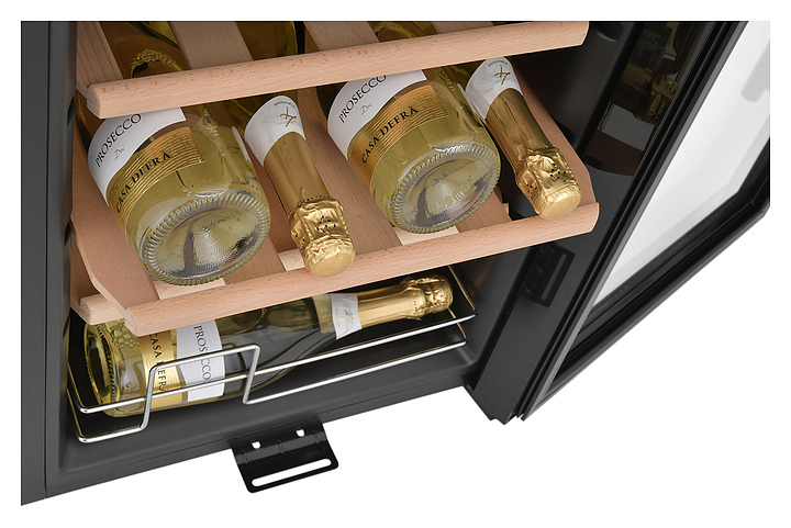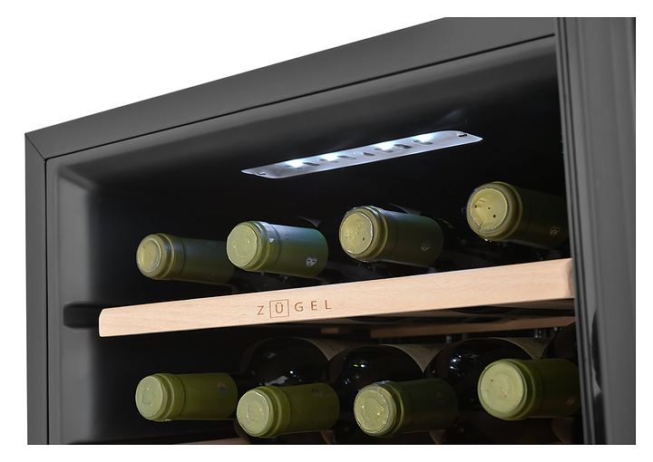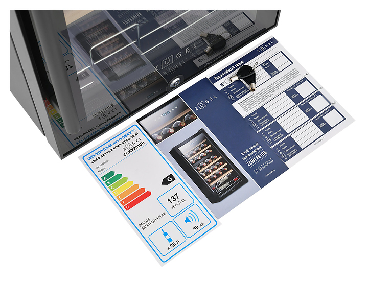 Винный шкаф Zugel ZCWF281DB предназначен для хранения при оптимальных условиях бутилированного вина различных сортов в барах, ресторанах, специализированных магазинах, подсобных складских помещениях, а также домашних условиях. Модель оснащена холодильной камерой c 2 температурными зонамии, интегрированными направляющими для полок, правосторонней распашной дверью с длинной трубчатой вертикальной рукояткой и обзорным остеклением, кабелем питания, расположенной на фасаде двери электронной панелью управления с сенсорными функциональными клавишами и цифровым жидкокристаллическим дисплеем с голубой подсветкой индикации. Корпус и рукоятка выполнены из металла с матовым антикоррозийным покрытием черного цвета, дверь с полным фронтальным остеклением без винтового крепежа, рама двери и внутренняя облицовка камеры черного цвета, остекление – из тонированного закаленного стекла, стандартные полки – из массива буковой древесины с фронтальной гравировкой логатипа, витринная полка – из металла. В комплект поставки входят 5 съемных стандартных полок с направляющими для размещения бутылок, витринная полка, комплект ключейк замку, инструкция по эксплуатации, гарантийный талон и заводская упаковка. Особенности: