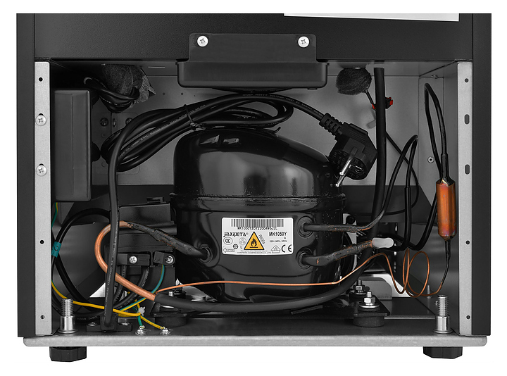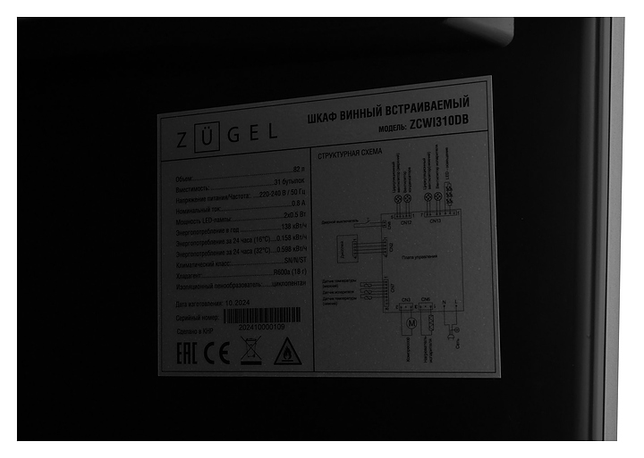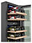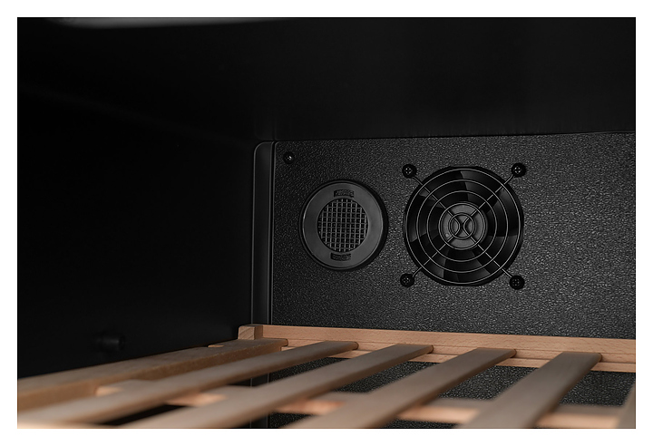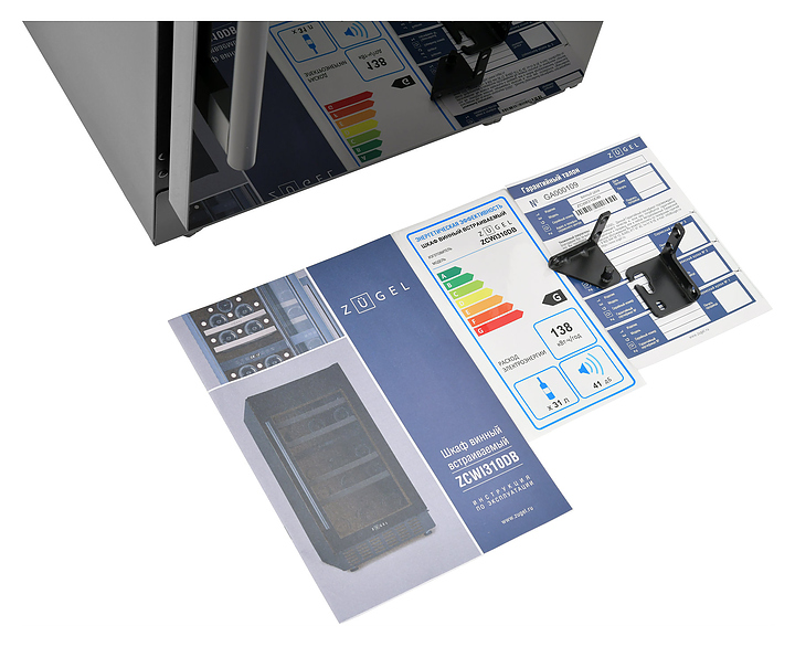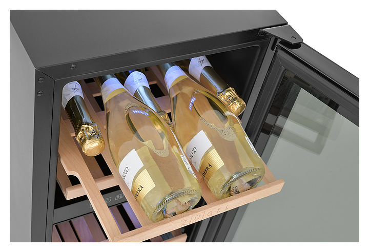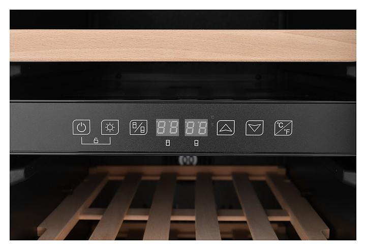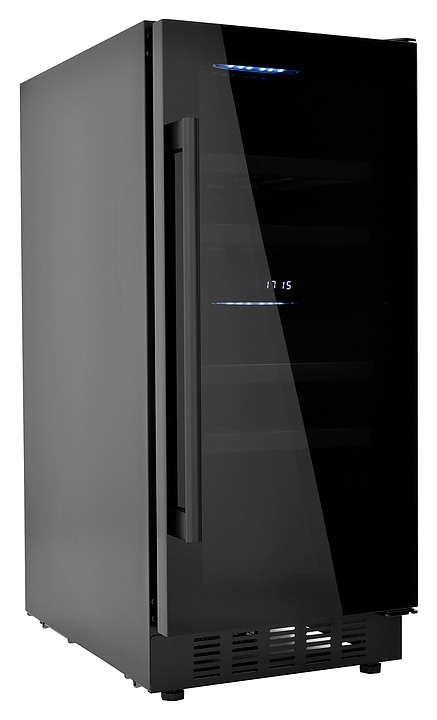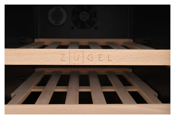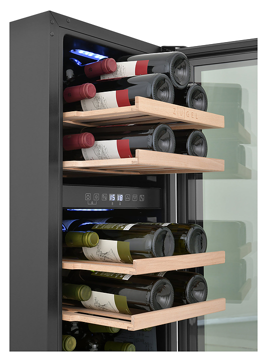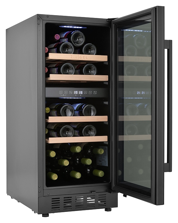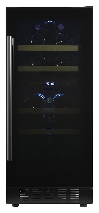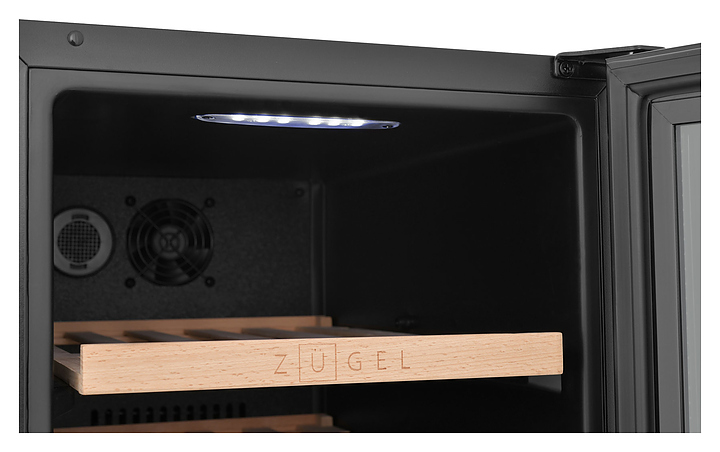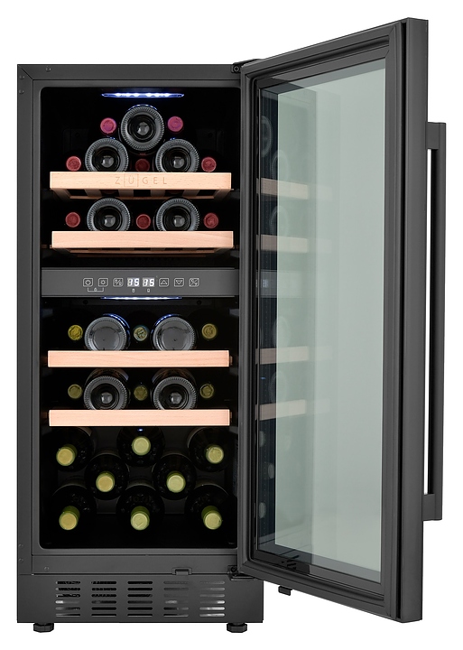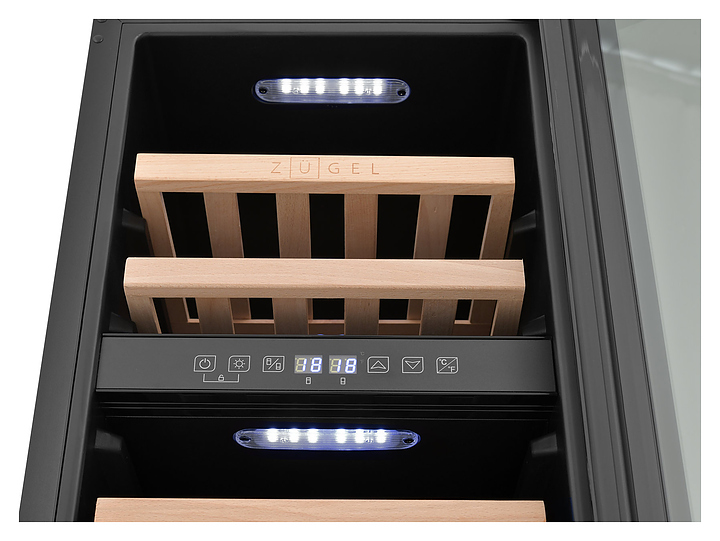 Винный шкаф Zugel ZCWI310DB предназначен для хранения при оптимальных условиях бутилированного вина различных сортов в барах, ресторанах, специализированных магазинах, подсобных складских помещениях, а также домашних условиях. Модель оснащена холодильной камерой c 2 температурными зонами, интегрированными направляющими для полок, правосторонней распашной дверью на перенавешиваемых петлях с длинной трубчатой вертикальной рукояткой и обзорным остеклением, цокольной вентиляционной решеткой, кабелем питания, расположенной внутри камеры электронной панелью управления с сенсорными функциональными клавишами и 2 цифровыми светодиодными дисплеями с белой подсветкой индикации. Корпус выполнен из металла с антикоррозийным покрытием, дверь с полным фронтальным остеклением без винтового крепежа, рама двери и внутренняя облицовка камеры черного цвета, рукоятка – из металла с матовым покрытием черного цвета, остекление – из закаленного стекла с дымчатой тонировкой, полки – из массива буковой древесины с фронтальной гравировкой логатипа. В комплект поставки входят 4 съемные полки с направляющими для размещения бутылок, набор крепежа, инструкция по эксплуатации, гарантийный талон и заводская упаковка. Особенности: