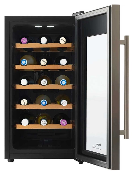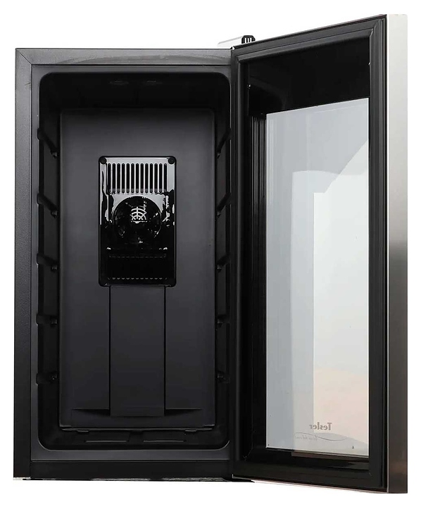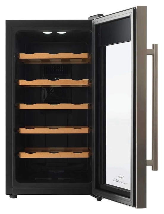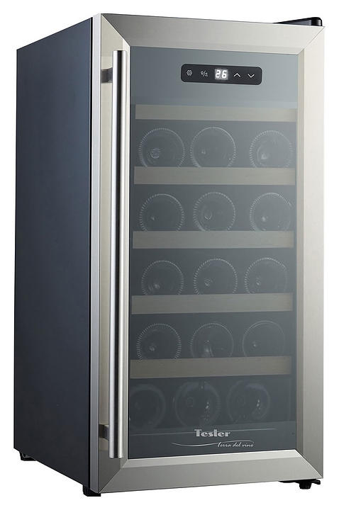 Винный шкаф TESLER WCV-182 предназначен для хранения при оптимальных условиях бутилированного вина различных сортов в барах, ресторанах, специализированных магазинах, подсобных складских помещениях, а также домашних условиях. Модель оснащена монотемпературной холодильной камерой с правосторонней распашной дверью с длинной вертикальной трубчатой рукояткой и обзорным остеклением, интегрированными направляющими для полок, кабелем питания, расположенной на фасаде двери электронной панелью управления с сенсорными функциональными клавишами и цифровым светодиодным дисплеем с белой подсветкой индикации. Корпус выполнен из металла с матовым антикоррозийным покрытием черного цвета, фронт рамы двери и рукоятка – из металла с серебристой поверхностью, внутренняя облицовка камеры черного цвета, остекление – из прозрачного закаленного стекла c зеркальной фронтальной поверхностью, полки – из массива древесины светлых пород. В комплект поставки входят 5 съемных полок с направляющими для размещения бутылок, инструкция по эксплуатации, гарантийный талон и заводская упаковка. Особенности: