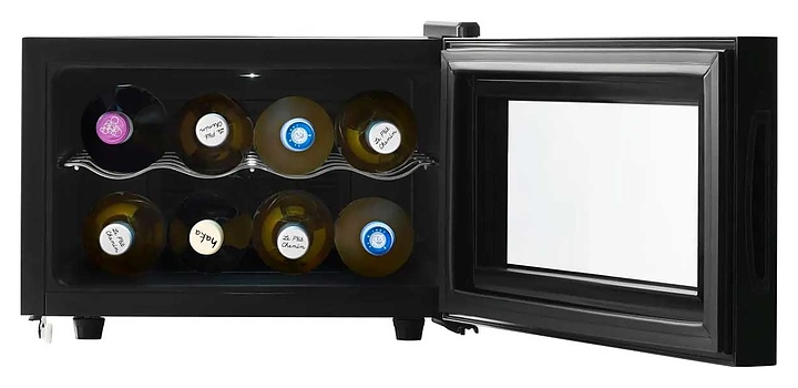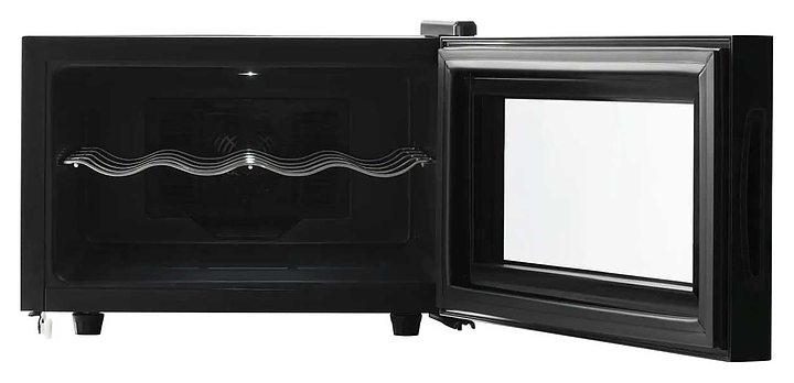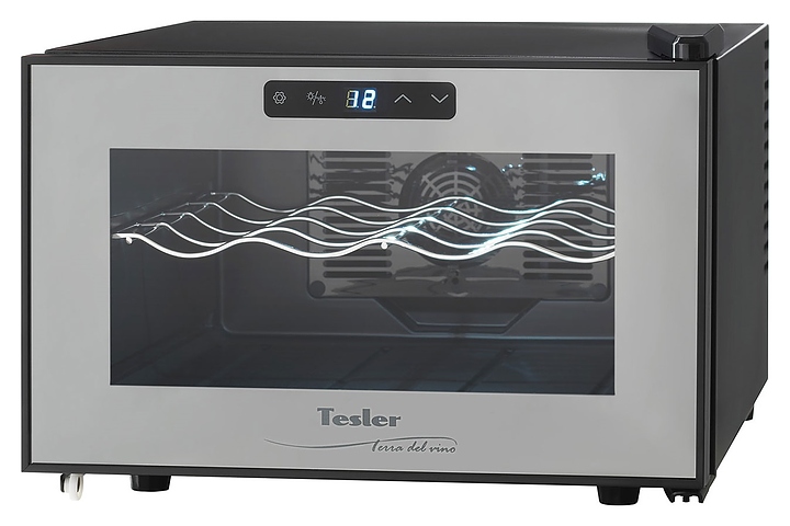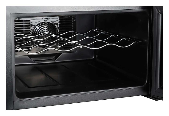 Винный шкаф TESLER WCH-082 предназначен для хранения при оптимальных условиях бутилированного вина различных сортов в барах, ресторанах, специализированных магазинах, подсобных складских помещениях, а также домашних условиях. Модель оснащена монотемпературной холодильной камерой c интегрированными направляющими для полки, правосторонней распашной дверью с обзорным остеклением, кабелем питания, расположенной на фасаде двери электронной панелью управления с сенсорными функциональными клавишами и цифровым жидкокристаллическим дисплеем с голубой подсветкой индикации. Корпус выполнен из металла с матовым антикоррозийным покрытием черного цвета, фронт рамы двери с серебристой поверхностью и полным фронтальным остеклением без винтового крепежа, остекление – из закаленного стекла, внутренняя облицовка камеры черного цвета, полка – из металла. В комплект поставки входят съемная решетчатая полка с углублениями для размещения бутылок, инструкция по эксплуатации, гарантийный талон и заводская упаковка. Особенности: