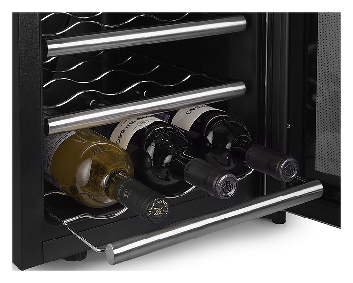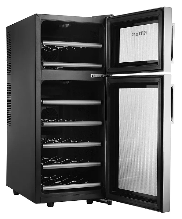 Винный шкаф Kitfort KT-2407 предназначен для хранения при оптимальных условиях бутилированного вина различных сортов в барах, ресторанах, специализированных магазинах, подсобных складских помещениях, а также домашних условиях. Модель оснащена 2 холодильными камерами с правосторонними распашными дверьми с вертикальными рукоятками и обзорным остеклением, интегрированными направляющими для полок, кабелем питания, расположенной на фасаде верхней двери электронной панелью управления с сенсорными функциональными клавишами и 2 цифровыми светодиодными дисплеями с белой подсветкой индикации. Корпус выполнен из металла с матовым антикоррозийным покрытием черного цвета, рамы дверей черного цвета с полным фронтальным остеклением без винтового крепежа, рукоятки и торцы дверей с серебристой поверхностью, внутренняя облицовка камер черного цвета, остекление – из тонированного закаленного стекла, полки – из металла. В комплект поставки входят 7 съемных решетчатых полок с углублениями для размещения бутылок, инструкция по эксплуатации, гарантийный талон и заводская упаковка. Особенности: