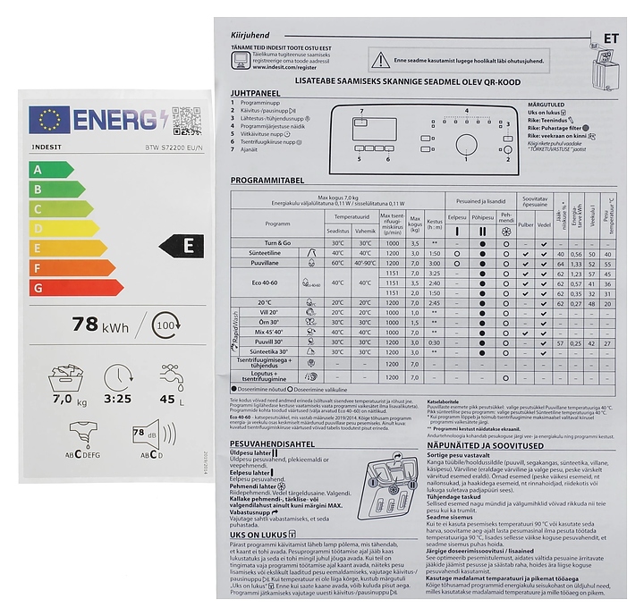 Температура по умолчанию (максимальная или диапазон) / максимальная скорость отжима / максимальная загрузка / длительность программы / остаточная влажность / энергопотребление (соответственно температуре стирки) / расход воды: