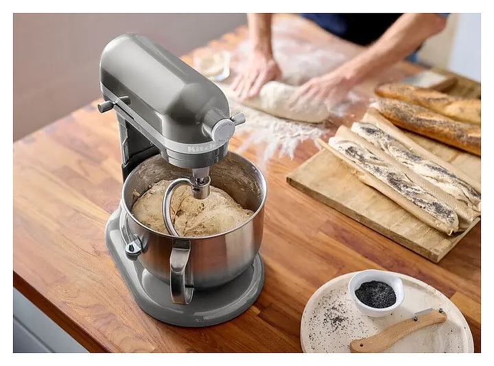 Настольный планетарный миксер KitchenAid Artisan 5KSM70SHXECU серии Heavy Duty используется в домашних условиях для замеса теста различной консистенции, в том числе белкового, заварного, дрожжевого, бисквитного, а также приготовления пюре, кремов, муссов и соусов. Механизм вращения месильного органа аналогичен поступательно-вращательному движению планет, причем насадка вращается вдоль своей оси в противоположном направлении поступательному движению, таким образом ингредиенты тщательно перемешиваются в однородную массу. Модель оснащена электродвигателем переменного тока, механизмом подъема и опускания чаши с фиксирующими лапками, кабелем питания с вилкой и электромеханической панелью управления. Литой корпус обтекаемой формы выполнен из цинка с покрытием износостойкой эмалью серебристого оттенка и декоративной серебристой полосой с логотипом по периметру нижней части головки моторного блока, рычаги управления – из металла с полимерными рукоятками, чаша – из нержавеющей стали с серебристой полированной поверхностью, венчик, крюк и лопатка – из нержавеющей стали, лопатка с гибким ребром – из металла с антибактериальным полиэфирным покрытием с содержанием серебра, защитный обод – из пластика. Комплектация: