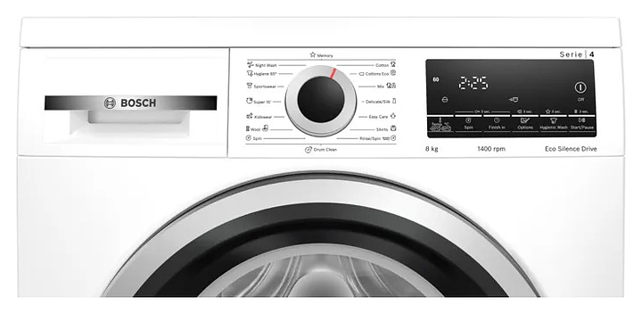 Стиральная машина Bosch WLS28460ME используется в квартирах и частных домах для стирки, полоскания и отжима белья, ткани и одежды. Модель оснащена фронтальной загрузкой, поворотным переключателем, сенсорными элементами и многофункциональным LED дисплеем, на котором отображается информация о ходе программы, времени до окончания стирки и максимальной загрузке для выбранной программы. Инверторный двигатель EcoSilence Drive отличается низким уровнем шума и долговечностью. Система ActiveWater/WaterPerfect автоматически определяет объем белья и подбирает оптимальное количество воды для стирки, контроль пенообразования гарантирует откачивание пены при чрезмерном образовании. Барабан VarioDrum выполнен из нержавеющей стали. 12 программ стирки: