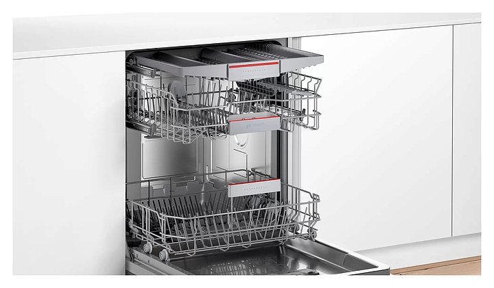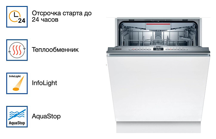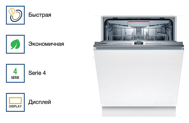 Посудомоечная машина Bosch SMV4HVX31E серии 4 предназначена для гигиенической обработки и последующей сушки различной посуды в домашних условиях. Модель оснащена инверторным двигателем EcoSilence Drive, моечной камерой с откидной дверью, закрытой панелью управления с кнопками и дисплеем. Световой индикатор InfoLight позволяет отслеживать завершение цикла мойки без открывания дверцы. Внутренний резервуар выполнен из нержавеющей стали и пластика. Особенности: