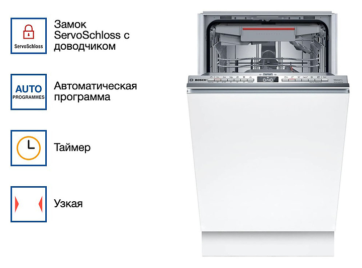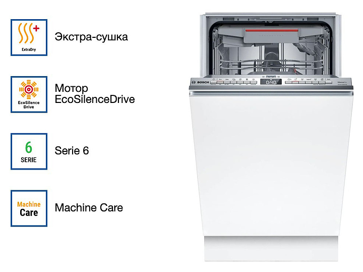 Посудомоечная машина Bosch SPV6EMX65Q серии 6 предназначена для гигиенической обработки и последующей сушки различной посуды в домашних условиях. Модель оснащена инверторным двигателем EcoSilence Drive, моечной камерой с откидной дверью, закрытой панелью управления с кнопками, дисплеем и регулируемыми по высоте ножками. Световой индикатор луч на полу InfoLight позволяет отслеживать окончание мойки без открывания дверцы. Система ActiveWater использует точное количество воды, необходимое для каждой загрузки в зависимости от количества и степени загрязненности посуды, что обеспечивает эффективное и экологически ответственное мытье. Внутренний резервуар выполнен из нержавеющей стали. Особенности: