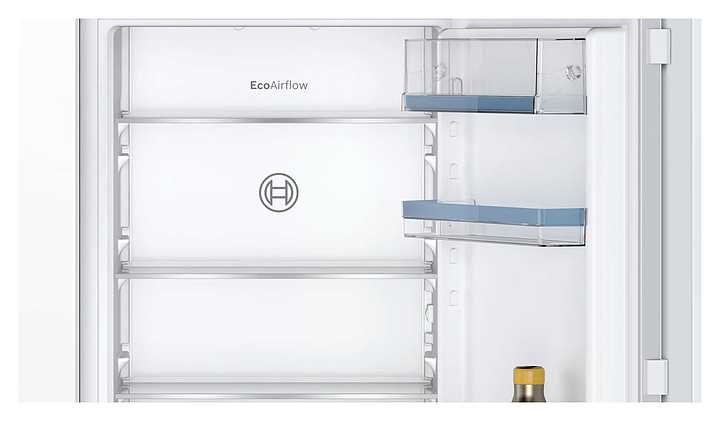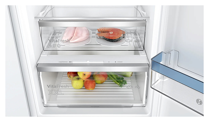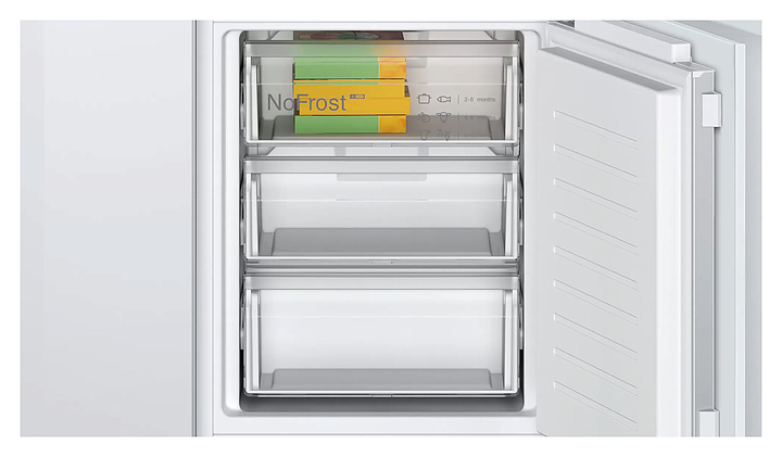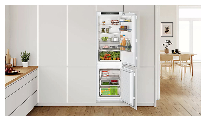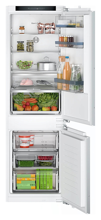 Встраиваемый холодильник Bosch KIN86VFE0 серии 4 предназначен для охлаждения, замораживания, кратковременного и длительного хранения продуктов питания в частных домах, квартирах, отелях и офисах. Модель оснащена холодильной камерой сверху и морозильной камерой снизу, электронным управлением с сенсорными элементами, дисплеем и внутренним светодиодным освещением. Функция MultiAirflow обеспечивает равномерное распределение холодного воздуха по всему объему для сохранения свежести продуктов дольше. Полки в холодильной камере выполнены из высокопрочного стекла. Особенности: