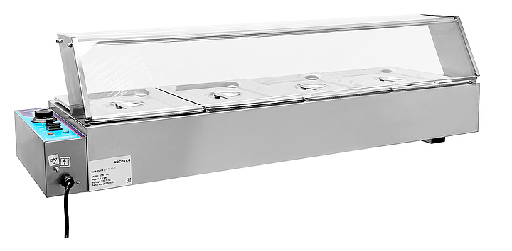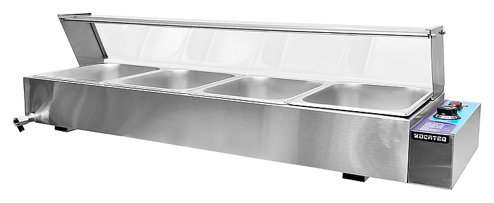 Мармит Kocateq BSB 4 GL линии Green Line предназначен для поддержания готовых блюд в горячем виде на предприятиях общественного питания и торговли, в школах и детских садах. Модель оснащена аналоговым термостатом для регулировки температуры и защитным термостатом, автоматически отключающим напряжение при повреждении основного термостата. Корпус выполнен из нержавеющей стали AISI 201 толщиной 0,7 мм, ванна - из нержавеющей стали AISI 201. В комплект поставки входят 4 гастроемкости GN 1/2 глубиной 100 мм с крышками. Особенности: