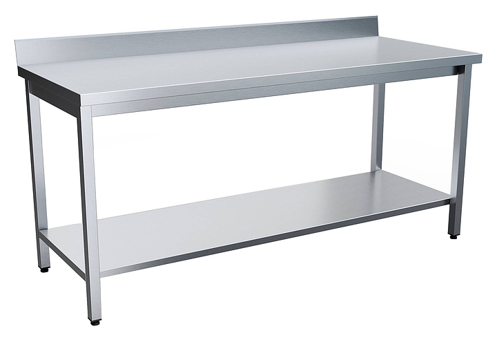 Стол Rada СТПУЧ-18/6-С предназначен для обработки продуктов питания, раскатки теста и хранения кухонной техники на предприятиях общественного питания и пищевой промышленности. Модель оснащена регулируемыми по высоте ножками, съемным бортом и сплошной полкой. Каркас выполнен из уголка нержавеющей стали AISI 430, столешница и полка из нержавеющей стали AISI 430 толщиной 0,8 мм, столешница усилена подложкой из фанеры толщиной 16 мм. Особенности: