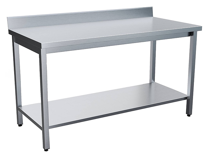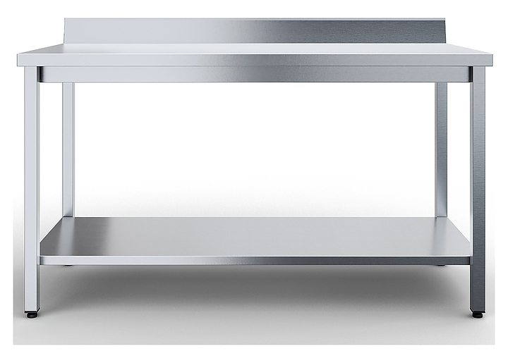 Стол Rada СТППЧ-15/6-С предназначен для обработки продуктов питания, раскатки теста и хранения кухонной техники на предприятиях общественного питания и пищевой промышленности. Модель оснащена регулируемыми по высоте ножками, съемным бортом и сплошной полкой. Каркас выполнен из профильной трубы квадратного сечения нержавеющей стали AISI 430, столешница и полка из нержавеющей стали AISI 430 толщиной 0,8 мм, столешница усилена подложкой из фанеры толщиной 16 мм. Особенности: