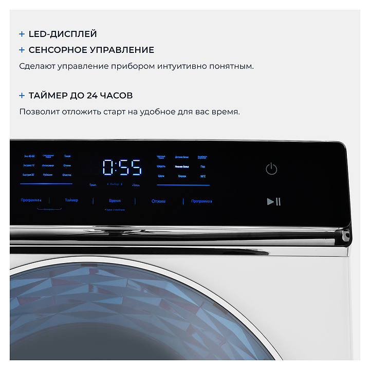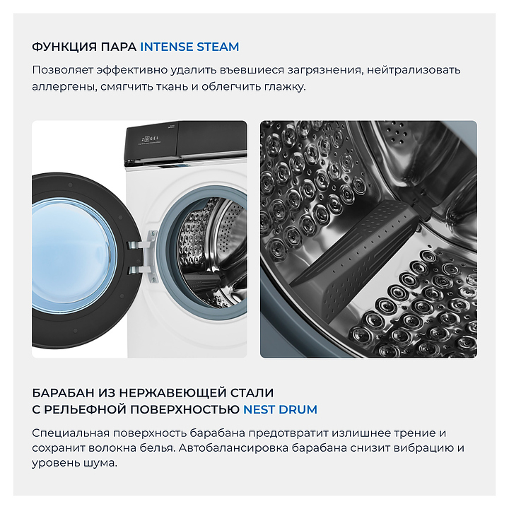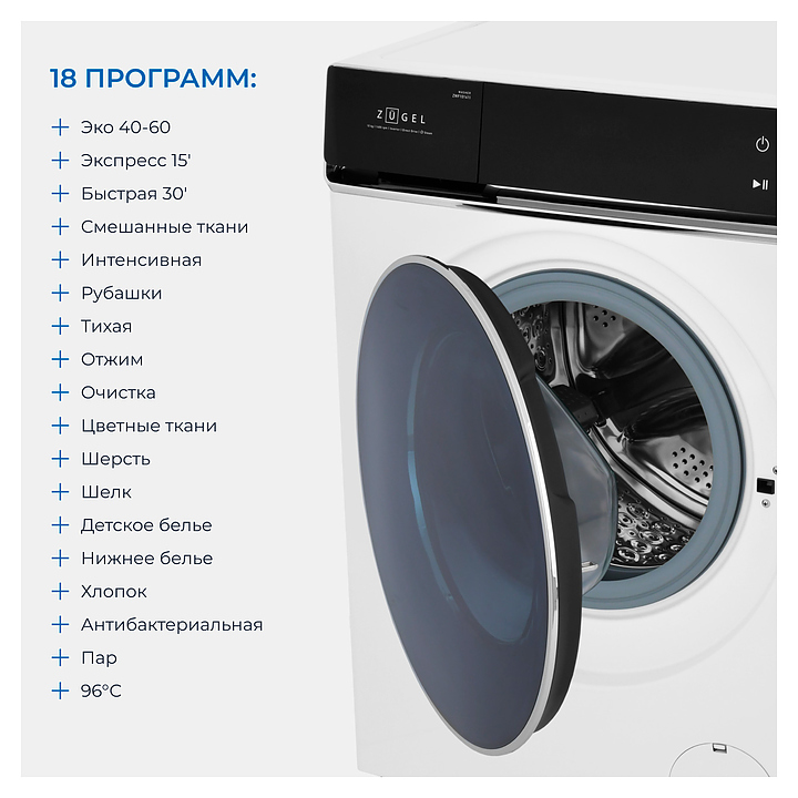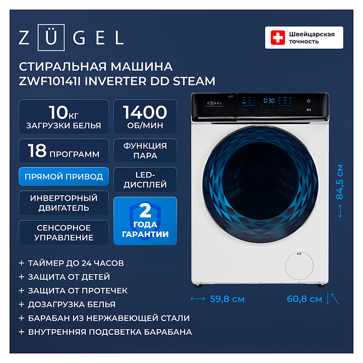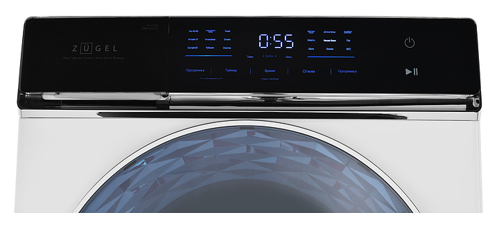 Стиральная машина Zugel ZWF10141I используется в квартирах и частных домах для стирки, полоскания и отжима белья, ткани и одежды. Модель оснащена фронтальной загрузкой, сенсорным дисплеем и таймером. Инверторный бесщеточный двигатель обеспечивает экономное потребление электроэнергии и низкий уровень шума, гарантирует высокое качество стирки и отжима, надежность и долговечность. Функция дозагрузки позволяет приостановить работу программы и добавить в бак белье в процессе стирки. Стирка с паром позволяет эффективно удалить въевшиеся загрязнения, нейтрализовать аллергены, смягчить ткань и облегчить глажку. Барабан выполнен из нержавеющей стали. 18 программ стирки: