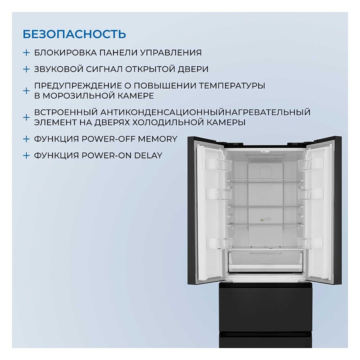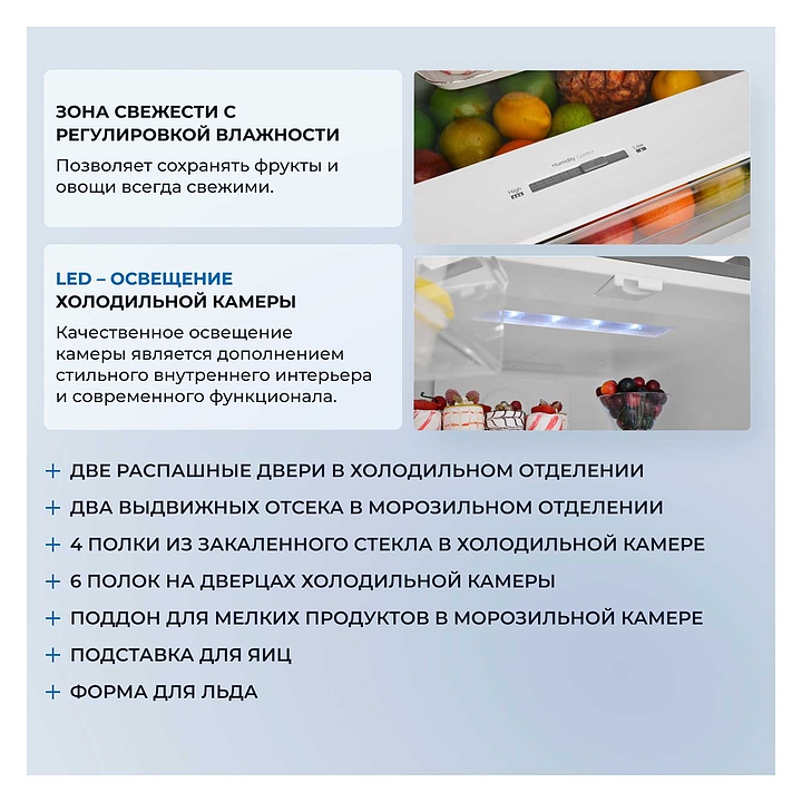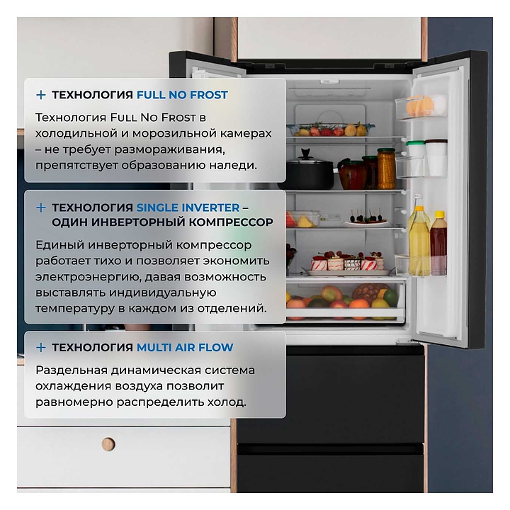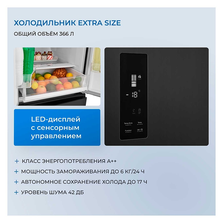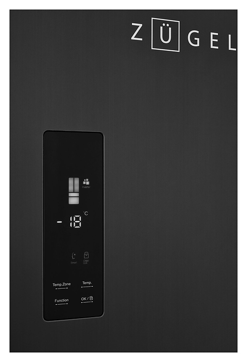 Холодильник Zugel ZRFD361B предназначен для охлаждения, замораживания, кратковременного и длительного хранения продуктов питания в частных домах, квартирах, отелях и офисах. Модель оснащена холодильной камерой сверху, морозильной камерой снизу, электронным управлением, сенсорным LED-дисплеем с расширенной индикацией и внутренним светодиодным освещением. Система охлаждения No Frost предотвращает образование льда и инея внутри холодильной и морозильной камер, что упрощает обслуживание, экономит энергию и поддерживает оптимальные условия для хранения продуктов. Фасад выполнен из брашированной стали, полки - из закаленного стекла, пенообразователь - циклопентан. Особенности:
