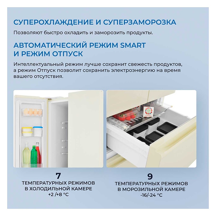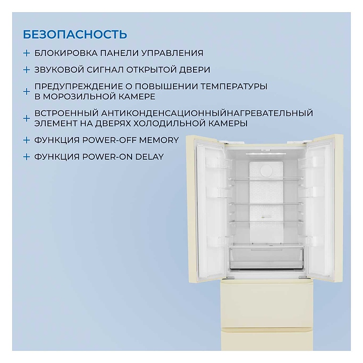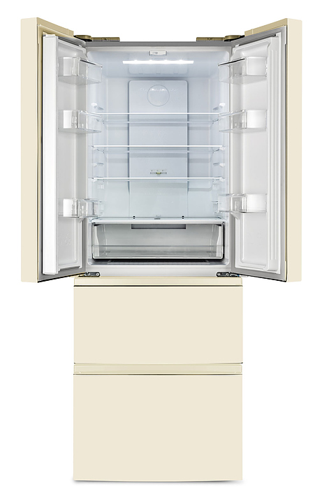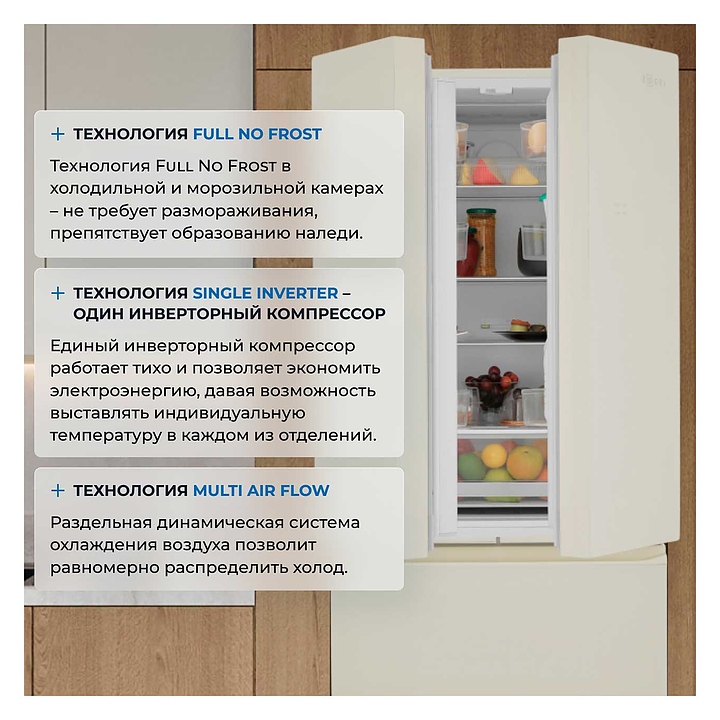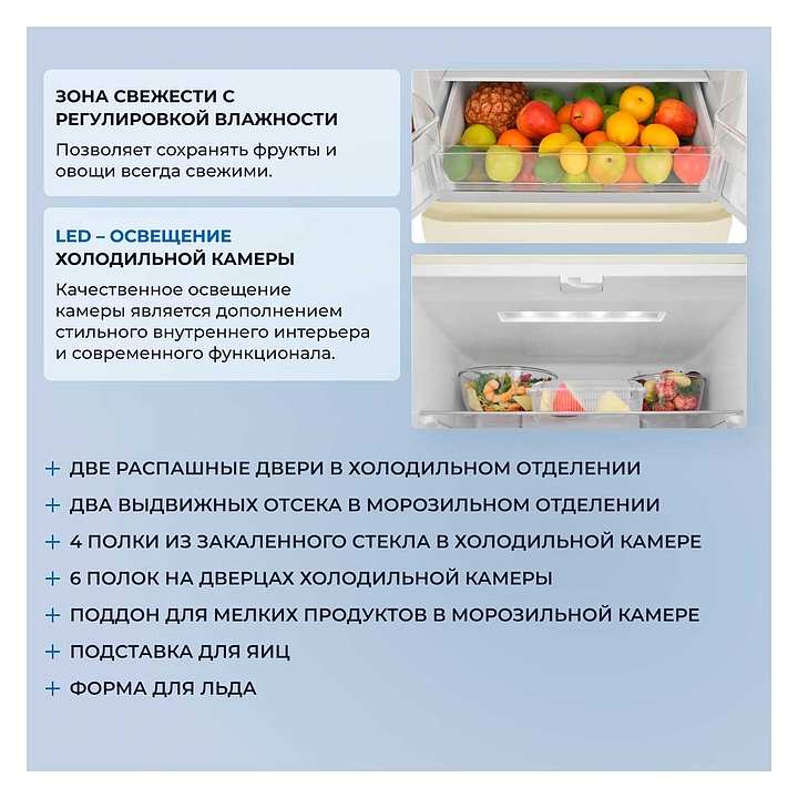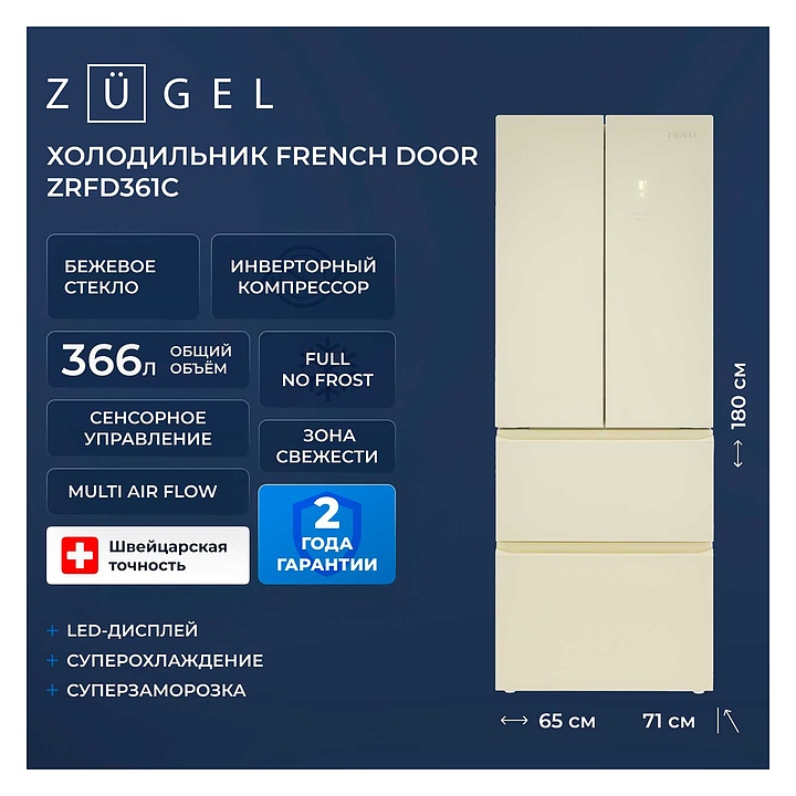 Холодильник Zugel ZRFD361C предназначен для охлаждения, замораживания, кратковременного и длительного хранения продуктов питания в частных домах, квартирах, отелях и офисах. Модель оснащена холодильной камерой сверху, морозильной камерой снизу, электронным управлением, сенсорным LED-дисплеем с расширенной индикацией и внутренним светодиодным освещением. Система охлаждения No Frost предотвращает образование льда и инея внутри холодильной и морозильной камер, что упрощает обслуживание, экономит энергию и поддерживает оптимальные условия для хранения продуктов. Фасад и полки выполнены из закаленного стекла, пенообразователь - циклопентан. Особенности: