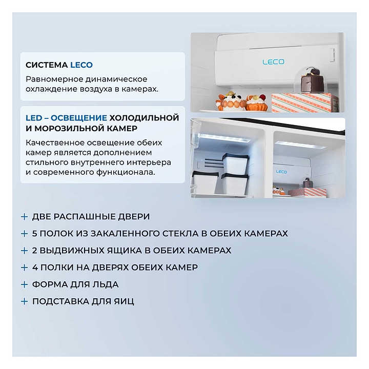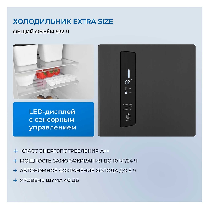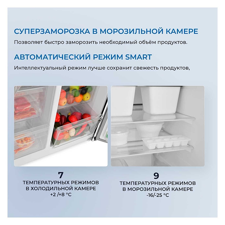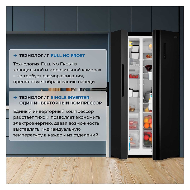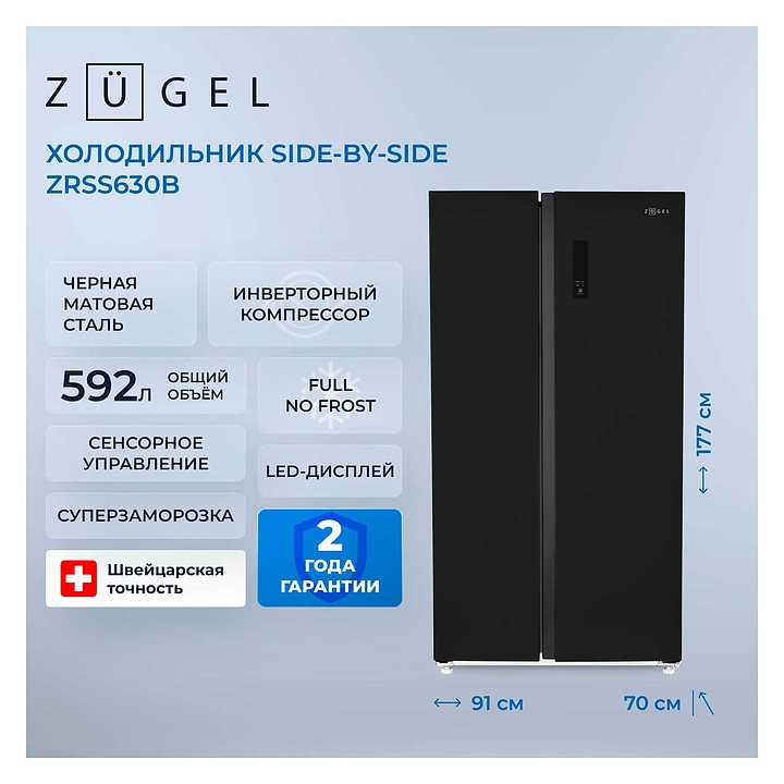 Холодильник Zugel ZRSS630B предназначен для охлаждения, замораживания, кратковременного и длительного хранения продуктов питания в частных домах, квартирах, отелях и офисах. Модель оснащена холодильной камерой справа, морозильной камерой слева, сенсорным управлением, LED-дисплеем и внутренним светодиодным освещением. Система охлаждения No Frost предотвращает образование льда и инея внутри холодильной и морозильной камер, что упрощает обслуживание, экономит энергию и поддерживает оптимальные условия для хранения продуктов. Фасад выполнен из металла, полки - из закаленного стекла Особенности: