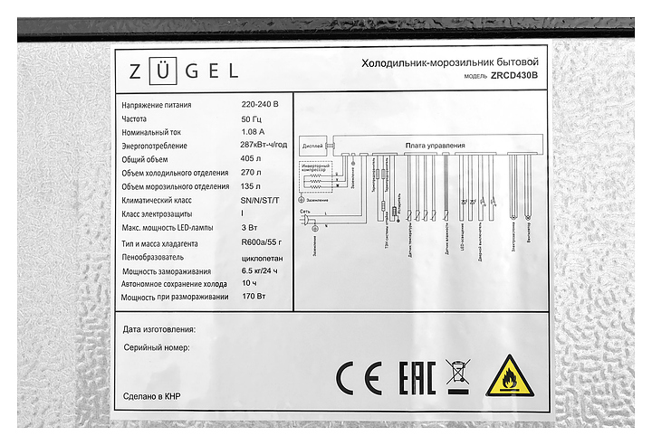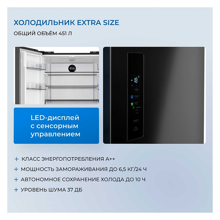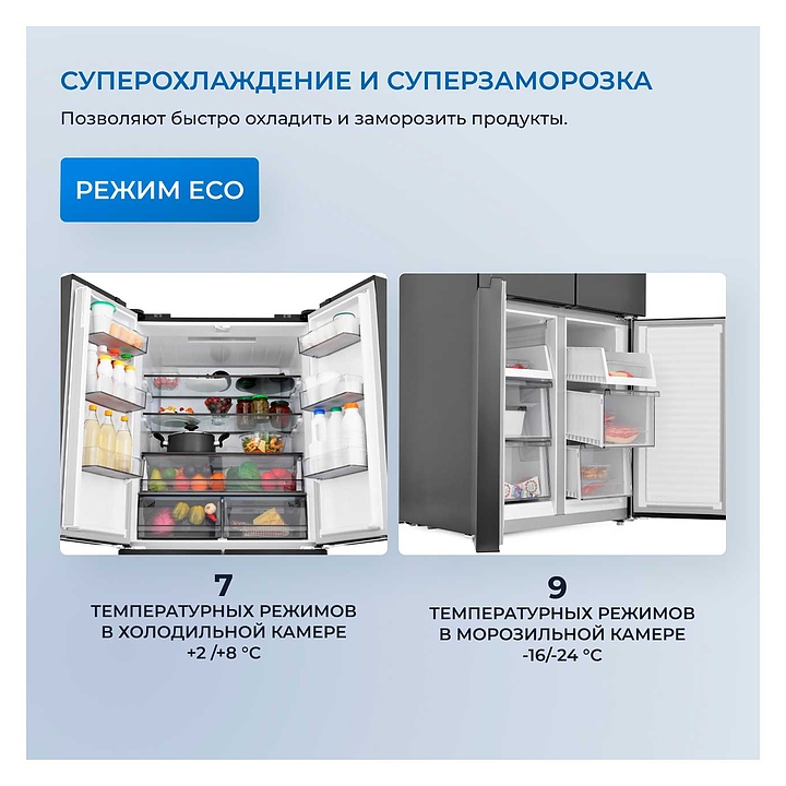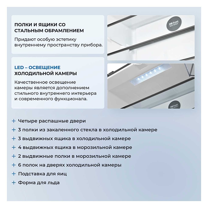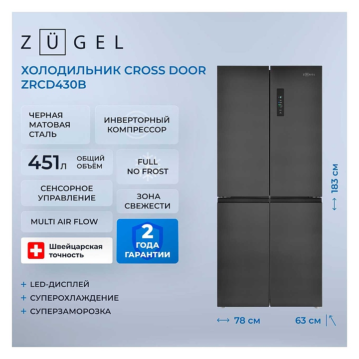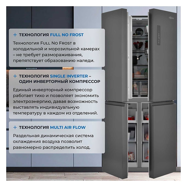 Холодильник Zugel ZRCD430B предназначен для охлаждения, замораживания, кратковременного и длительного хранения продуктов питания в частных домах, квартирах, отелях и офисах. Модель оснащена 4 распашными дверьми, сенсорным управлением, сенсорным LED-дисплеем с индикацией температуры и внутренним светодиодным освещением. Система охлаждения No Frost предотвращает образование льда и инея внутри холодильной и морозильной камер, что упрощает обслуживание, экономит энергию и поддерживает оптимальные условия для хранения продуктов. Встроенный антиконденсационный нагревательный элемент предотвращает образование конденсата на перегородке между холодильной и морозильной камерами. Фасад выполнен из брашированной стали, полки - из закаленного стекла, отделка полок и ящиков - из стали. Особенности: