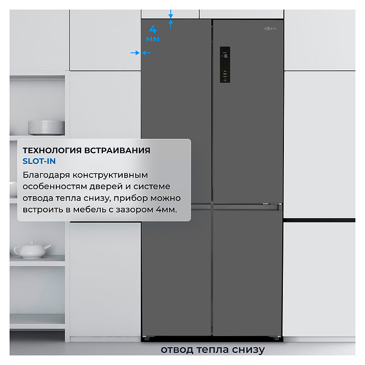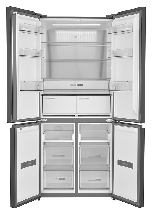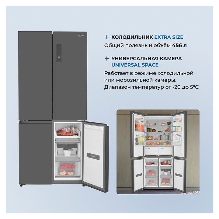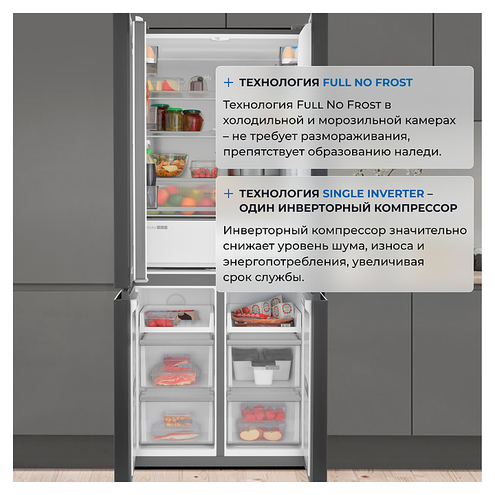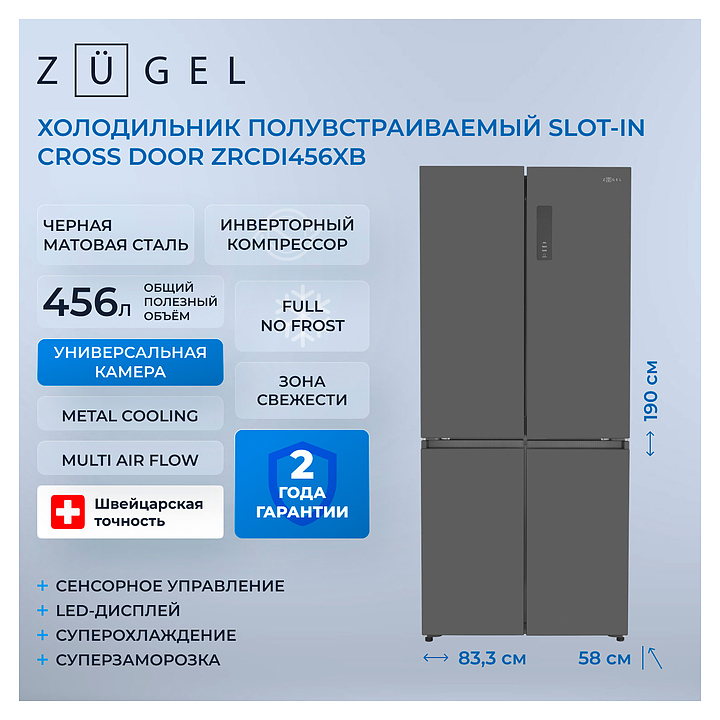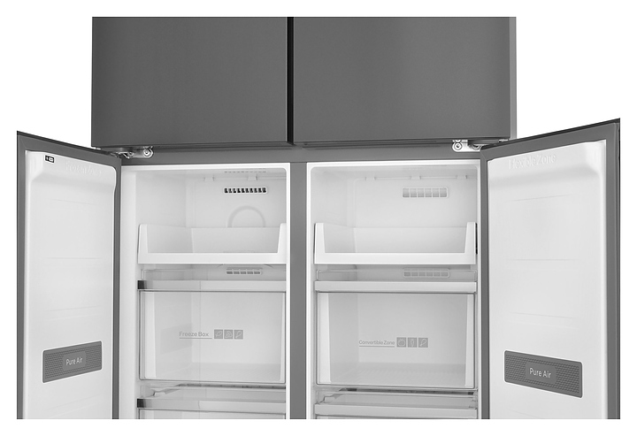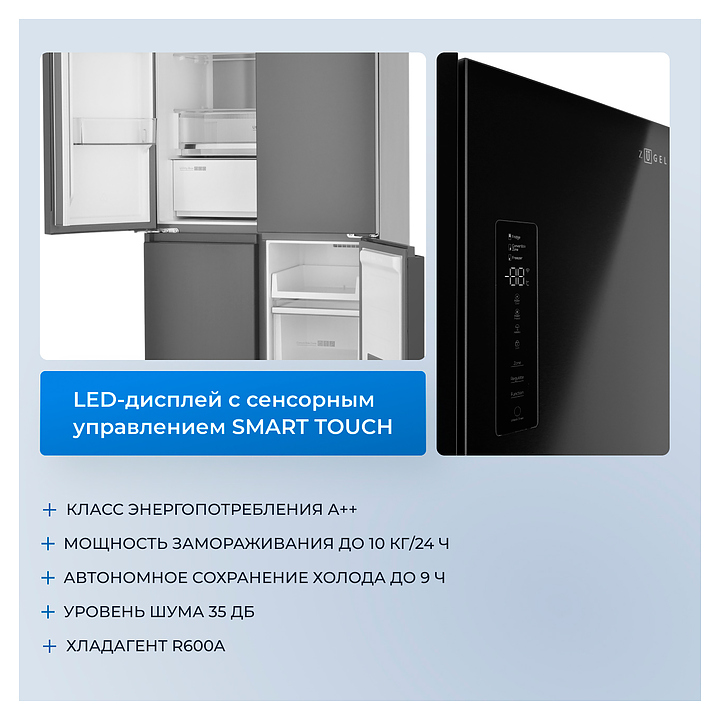 Холодильник Zugel ZRCDI456XB предназначен для охлаждения, замораживания, кратковременного и длительного хранения продуктов питания в частных домах, квартирах, отелях и офисах. Модель оснащена 4 распашными дверьми, сенсорным управлением, сенсорным LED-дисплеем с индикацией температуры, внутренним светодиодным освещением и регулируемыми по высоте ножками. Система охлаждения No Frost предотвращает образование льда и инея внутри холодильной и морозильной камер, что упрощает обслуживание, экономит энергию и поддерживает оптимальные условия для хранения продуктов. Инверторный компрессор обеспечивает экономное потребление электроэнергии и низкий уровень шума при работе. Фасад выполнен из брашированной стали, полки - из закаленного стекла, пенообразователь - циклопентан. Особенности: