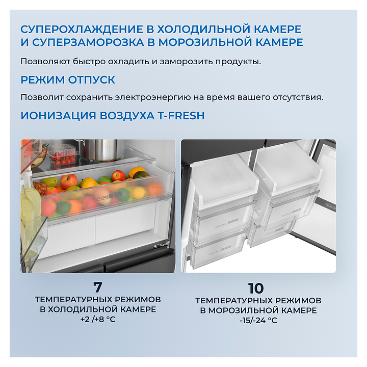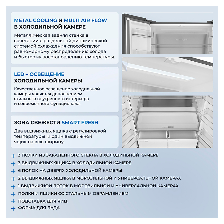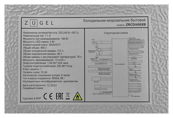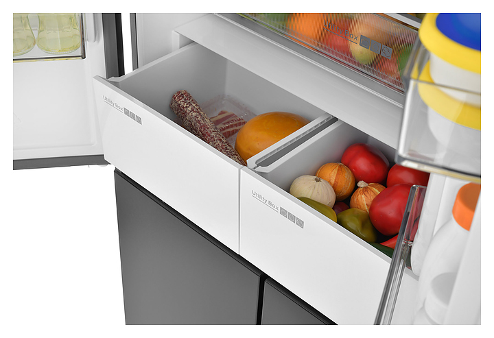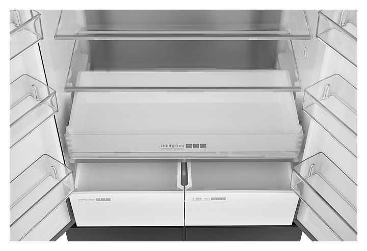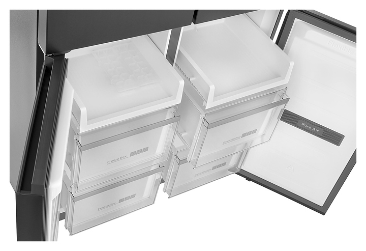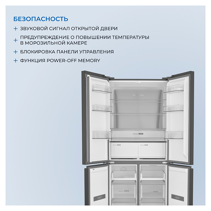 Холодильник Zugel ZRCDI456XB предназначен для охлаждения, замораживания, кратковременного и длительного хранения продуктов питания в частных домах, квартирах, отелях и офисах. Модель оснащена 4 распашными дверьми, сенсорным управлением, сенсорным LED-дисплеем с индикацией температуры, внутренним светодиодным освещением и регулируемыми по высоте ножками. Система охлаждения No Frost предотвращает образование льда и инея внутри холодильной и морозильной камер, что упрощает обслуживание, экономит энергию и поддерживает оптимальные условия для хранения продуктов. Инверторный компрессор обеспечивает экономное потребление электроэнергии и низкий уровень шума при работе. Фасад выполнен из брашированной стали, полки - из закаленного стекла, пенообразователь - циклопентан. Особенности: