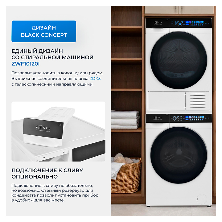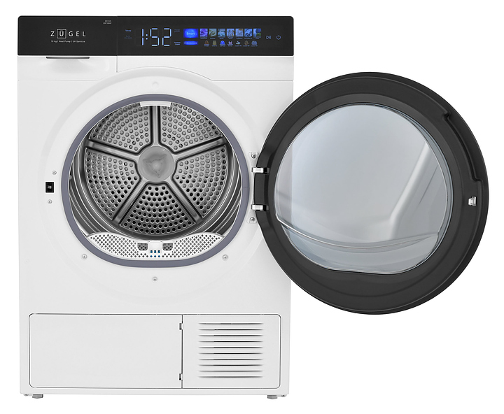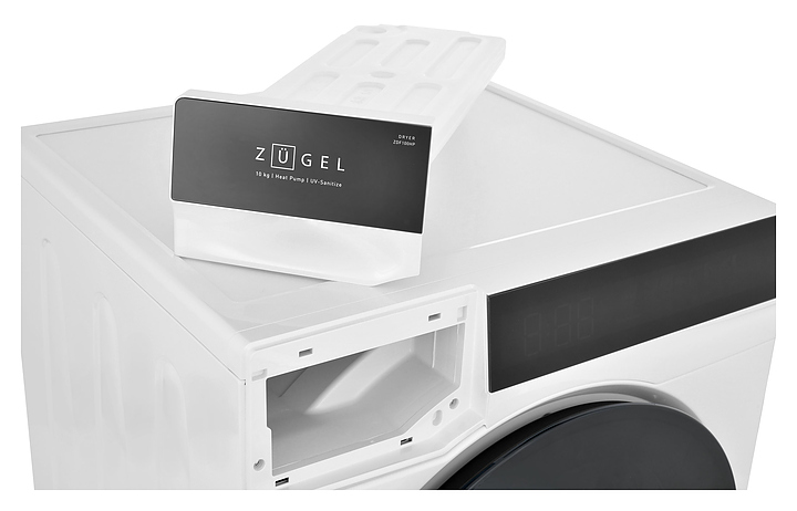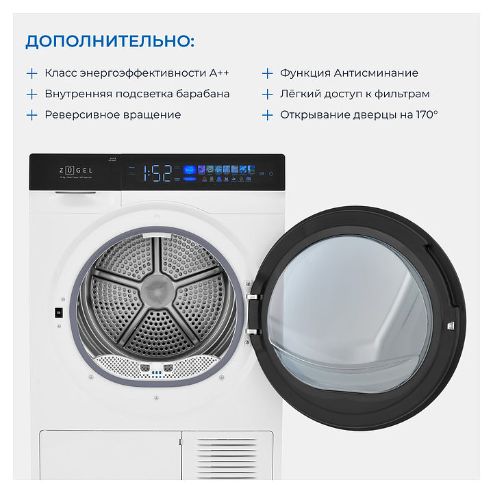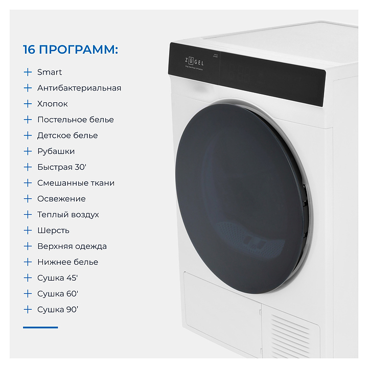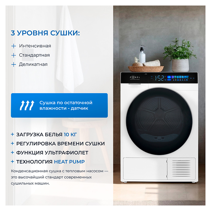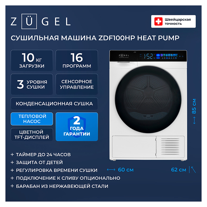 Сушильная машина Zugel ZDF100HP используется в квартирах и частных домах для сушки одежды, белья и тканей после стирки. Модель оснащена фронтальным прозрачным люком со смотровым окном, тепловым насосом, цветным TFT-дисплеем с расширенной индикацией и электронным сенсорным управлением. Внутреннее освещение гарантируют комфорт при загрузке и выгрузке. Интеллектуальная программа Smart автоматически настраивает параметры сушки в соответствии с весом загруженных вещей для достижения наилучшего результата. Обработка ультрафиолетовым облучением убивает бактерии, вирусы и аллергены, дезинфицирует белье, предотвращает появление грибков, плесени и неприятных запахов. Барабан выполнен из нержавеющей стали. 16 программ: