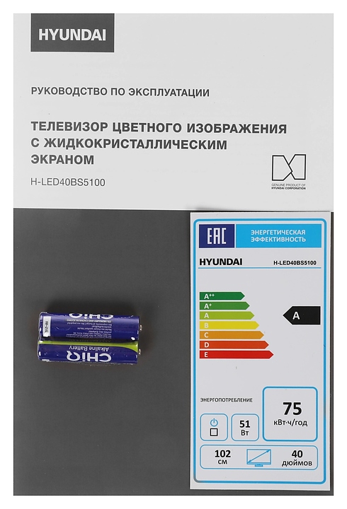 Телевизор Hyundai H-LED40BS5100 предназначен для приема и воспроизведения видео и аудио контента с различных ресурсов таких как телевещание, Интернет, дополнительное подключаемое оборудование и физические носители в домашних условиях, гостиницах, офисах, холлах и кабинетах различных учреждений. Прибор оснащен плоским монитором, акустической стереосистемой с 2 встроенными динамиками, встроенным блоком питания, кабелем питания с вилкой и основным выключателем, пульт – кнопочной клавиатурой. Кожух прибора выполнен из ударопрочного полимера с матовой поверхностью черного цвета, фронтальная рамка и опоры с поверхностью серого оттенка, корпус пульта – из черного пластика.