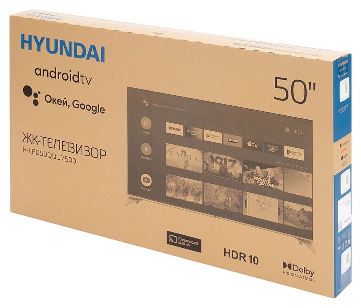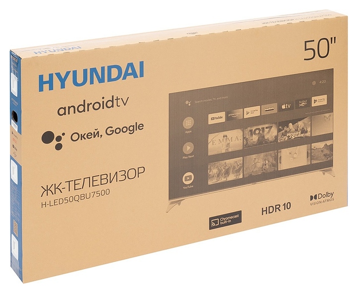 Телевизор Hyundai H-LED50QBU7500 предназначен для приема и воспроизведения видео и аудио контента с различных ресурсов таких как телевещание, Интернет, дополнительное подключаемое оборудование и физические носители в домашних условиях, гостиницах, офисах, холлах и кабинетах различных учреждений. Прибор оснащен плоским монитором, акустической стереосистемой с 2 встроенными динамиками, встроенным блоком питания, кабелем питания с вилкой и основным выключателем, пульт – кнопочной клавиатурой. Кожух прибора выполнен из ударопрочного полимера с матовой поверхностью черного цвета, нижняя рамка и опоры – из металла с поверхностью серебристого оттенка, корпус пульта – из черного пластика.
