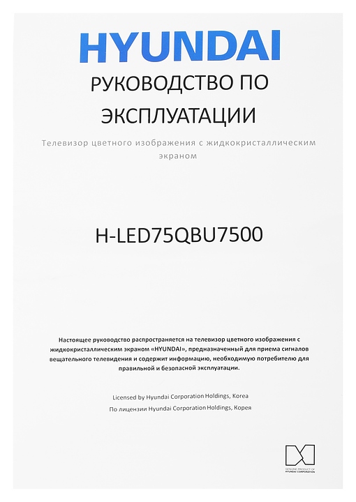 Телевизор Hyundai H-LED75QBU7500 предназначен для приема и воспроизведения видео и аудио контента с различных ресурсов таких как телевещание, Интернет, дополнительное подключаемое оборудование и физические носители в домашних условиях, гостиницах, офисах, холлах и кабинетах различных учреждений. Прибор оснащен плоским монитором, акустической стереосистемой с 2 встроенными динамиками, встроенным блоком питания, кабелем питания с вилкой и основным выключателем, пульт – кнопочной клавиатурой. Кожух прибора выполнен из ударопрочного полимера с матовой поверхностью черного цвета, нижняя рамка и опоры – из металла с поверхностью серебристого оттенка, корпус пульта – из черного пластика.