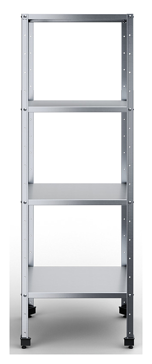 Кухонный стеллаж Rada СКСПЧ-4/5/0,4/0,4/18-4С предназначен для хранения посуды, инвентаря и сухих продуктов на предприятиях общественного питания и торговли. Разборный каркас выполнен из тубы 40x40 мм нержавеющей стали AISI 430, полки - из нержавеющей стали AISI 430. Особенности: