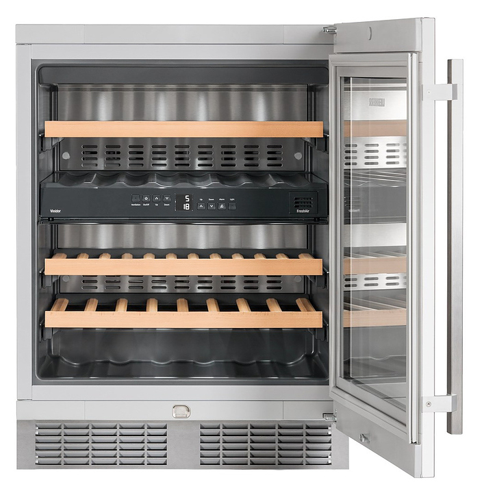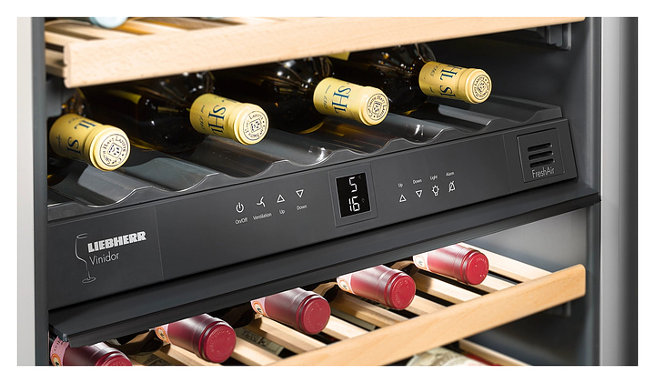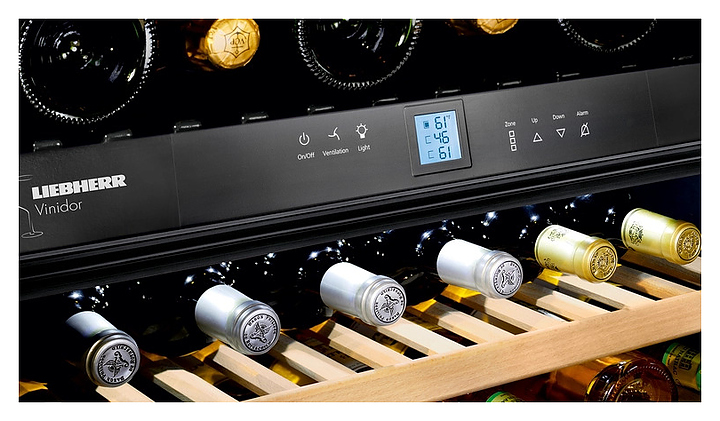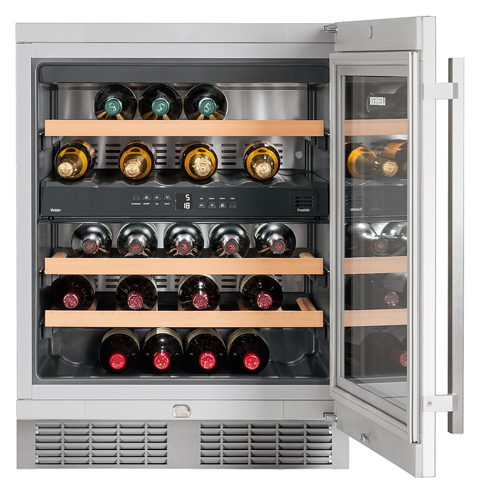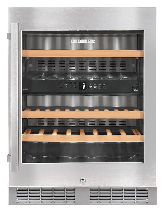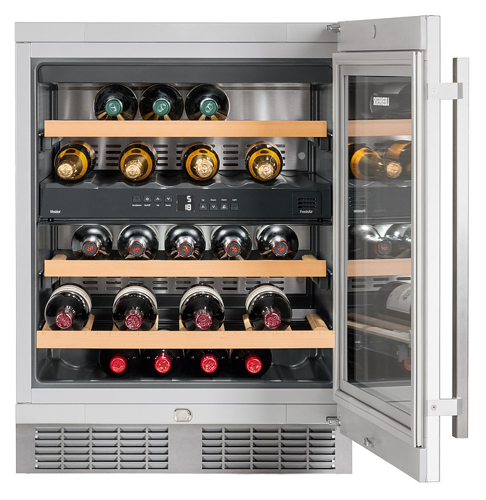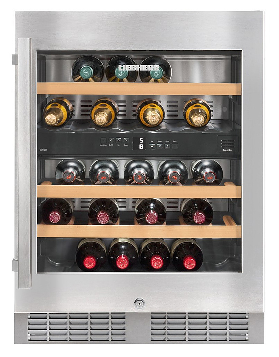 Винный шкаф Liebherr UWTes 1672 серии Vinidor предназначен для охлаждения и длительного хранения разливного вина в частных домах, квартирах, отелях и офисах. Модель оснащена кнопочным управлением и дисплеем MagicEye с цифровой индикацией температуры. Боковые стенки выполнены из нержавеющей стали, дверь - из стекла в раме из нержавеющей стали, ручка - из алюминия, полки - из дерева. Особенности: