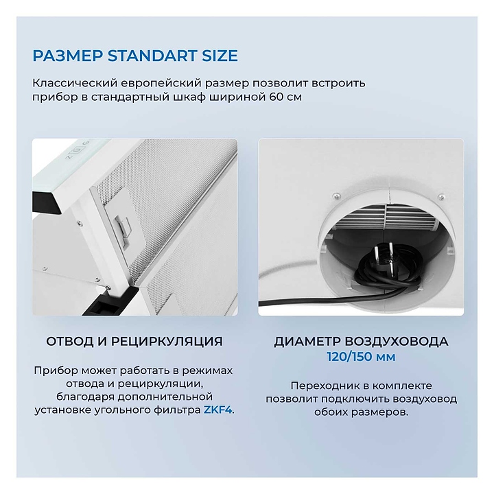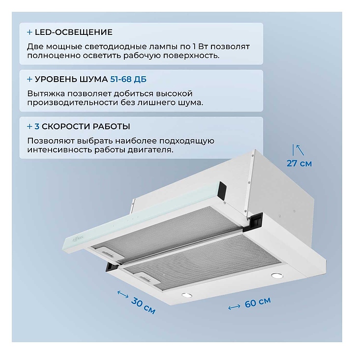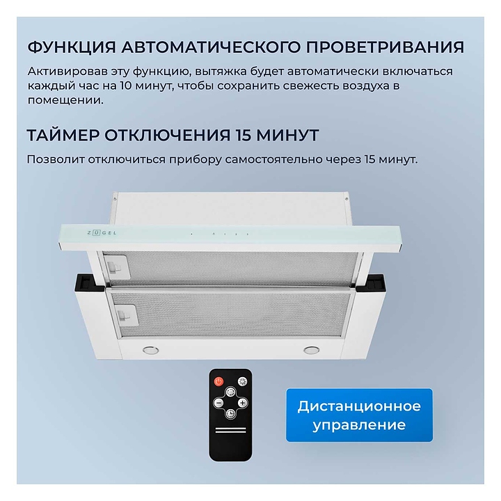 Кухонная вытяжка Zugel ZHT652GW используется в домашних условиях для очистки воздуха от продуктов горения, копоти и запахов в процессе приготовления пищи путем принудительной вентиляции. Модель оснащена электронным сенсорным управлением, таймером и 3 скоростями. Слайдерная технология гарантирует компактность и позволяет увеличить площадь эффективной работы. Пульт дистанционного управления увеличивает комфорт и позволяет использовать весь функционал прибора на расстоянии. Светодиодные лампы гарантируют яркое и равномерное освещение рабочей зоны. Функция автоматического проветривания сохраняет свежесть воздуха в помещении. Корпус выполнен из крашеной стали, панель - из закаленного стекла, жировой фильтр - из алюминия. В комплект поставки входят 2 жироулавливающих фильтра. Особенности: