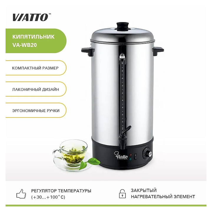 Электрокипятильник VIATTO MK-WB20 предназначен для приготовления кипятка для варки гарниров, овощей, сосисок, пельменей и других продуктов питания, а также для заваривания и приготовления горячих напитков, стерилизации кухонной и столовой посуды, столовых приборов на предприятиях общественного питания и торговли. Модель оснащена закрытым нагревательным элементом. Корпус выполнен из нержавеющей стали и пластика. Особенности: