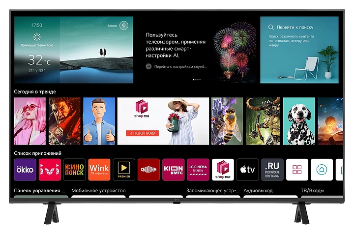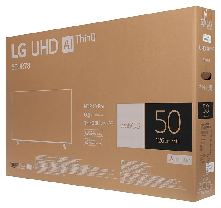 Телевизор LG 50UR78006LK.ARUG предназначен для приема и воспроизведения видео и аудио контента с различных ресурсов таких как телевещание, Интернет, дополнительное подключаемое оборудование и физические носители в домашних условиях, гостиницах, офисах, холлах и кабинетах различных учреждений. Прибор оснащен плоским монитором, акустической стереосистемой с 2 встроенными направленными вниз динамиками, встроенным блоком питания, кабелем питания с вилкой и основным выключателем, пульт – кнопочной клавиатурой. Кожух прибора выполнен из ударопрочного полимера с матовой поверхностью черного цвета, фронтальная рамка и опоры с поверхностью черного цвета, корпус пульта – из черного пластика.