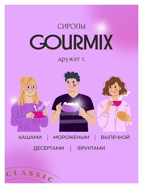 Сироп Gourmix Лаванда используется в напитках на предприятиях общественного питания и торговли. Натуральный аромат делает сироп совершенно другим, по сравнению с конкурентами. Насыщенный вкус раскрывается в привычных сочетаниях в кофейных напитках, лимонадах, алкогольных напитков. Пробовать исключительно в сочетании с напитками. В чистом виде большинство клиентов не понимает все прелести вкуса. Состав: сахар, вода питьевая, натуральные ароматизаторы, регулятор кислотности (лимонная кислота), консервант (сорбат калия), краситель (антоцианы), экстракт гардении (содержит эмульгатор (полиоксиэтилен(20) сорбитан моноолеат, Твин80), антиокислители (аскорбат натрия, аскорбиновая кислотаL-)). Особенности: