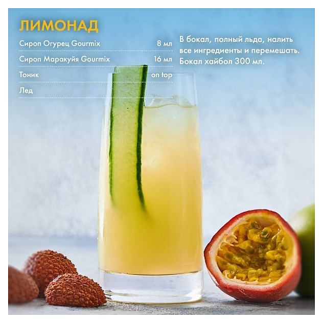 Сироп Gourmix Fruit Innovations Огурец используется в напитках на предприятиях общественного питания и торговли. Огуречный лимонад изобрели оптимисты. Кто же ещё мог разглядеть в зелёном огородном молодце такой богатый потенциал для прохладительных напитков? Это поистине гениальная находка открыла сиропу со вкусом огурца летние веранды кафе и ресторанов во всех городах мира. И вот сегодня меню без огуречного напитка – уже не комильфо. Огурец – не капризный парень. Отлично ладит с яркими вкусами можжевеловых ягод, имбиря и маракуйи. Этим нужно воспользоваться! Состав: Сахар, вода питьевая, ароматизатор натуральный, регулятор кислотности (лимонная кислота), консервант (сорбат калия). Особенности: