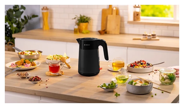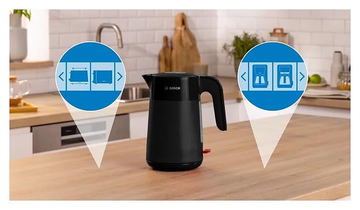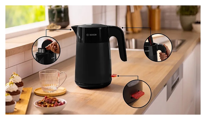 Чайник Bosch TWK2M163 предназначен для нагрева и кипячения воды при приготовлении чая и кофе в частных домах, квартирах, отелях и офисах. Модель оснащена закрытой спиралью нагрева. Благодаря функции «Защита от перегрева» чайник выключится и не перегорит при отсутствии воды. Переключатель Lift Switch Off гарантирует автоматическое отключение при снятии с подставки, что позволяет избежать перегрева и повреждения устройства, а также снижает энергопотребление и минимизирует вероятность поражения электрическим током. Корпус выполнен из пластика. В комплект поставки входит подставка. Особенности:
