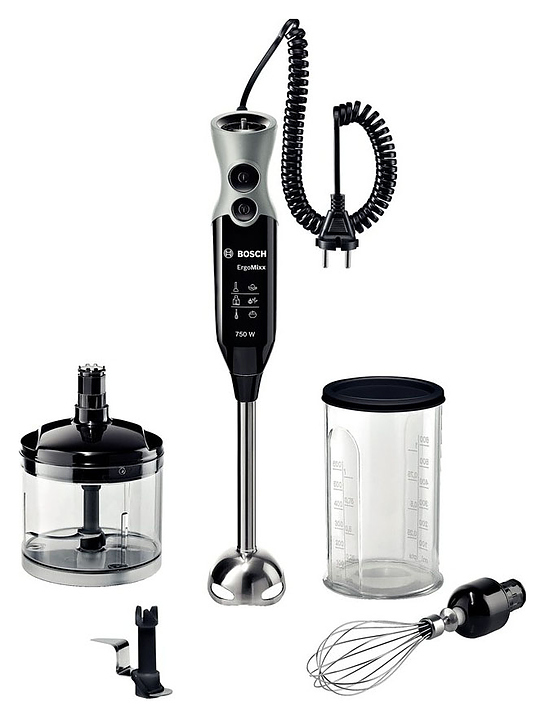 Погружной блендер Bosch MSM67170 серии ErgoMixx предназначен для измельчения зелени, орехов, сыров, взбивания яичных белков и сливок в домашних условиях. Модель оснащена ножом с 4 лезвиями QuattroBlade, эргономичной ручкой с мягким покрытием Soft-touch, турборежимом, удобно расположенными функциональными кнопками и переключателем. Съемные детали можно мыть в посудомоечной машине. Корпус и чаша измельчителя выполнены из пластика, погружная часть - из нержавеющей стали. Комплектация: