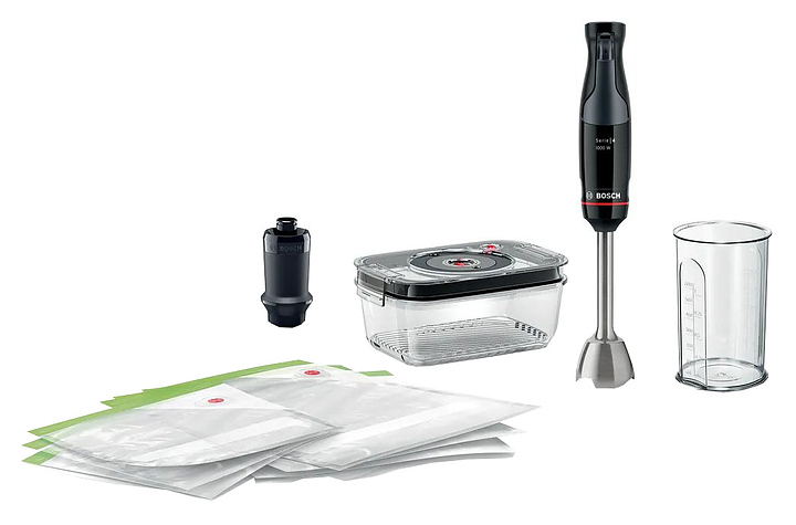 Вакуумный блендер Bosch MSM4B6V2 серии MaxoMixx предназначен для измельчения фруктов, овощей, орехов и трав, а также приготовления соусов, смузи и супов-пюре в домашних условиях. Модель оснащена ножом с 4 лезвиями QuattroBlade, эргономичной ручкой, кнопками и бесступенчатой регулировкой скорости. Насос для вакуумирования, специальные контейнер и пакеты продлевают свежесть продуктов и срок хранения в 2 раза дольше, чем в обычных емкостях. Турбо-режим обеспечивает максимальную мощность за короткое время для быстрого измельчения твердых продуктов и приготовления однородных смесей, коктейлей и пюре. Съемные детали можно мыть в посудомоечной машине. Корпус выполнен из пластика, погружная часть - из нержавеющей стали. В комплект поставки входят мерный стакан, венчик для взбивания, вакуумный насос, вакуумный контейнер и вакуумные пакеты с замком. Дополнительные характеристики: