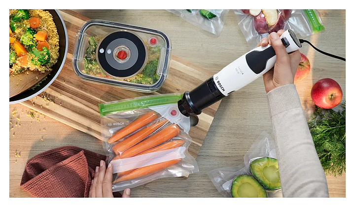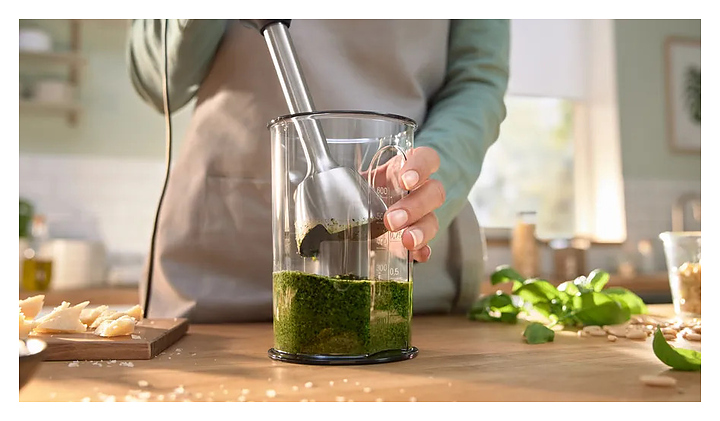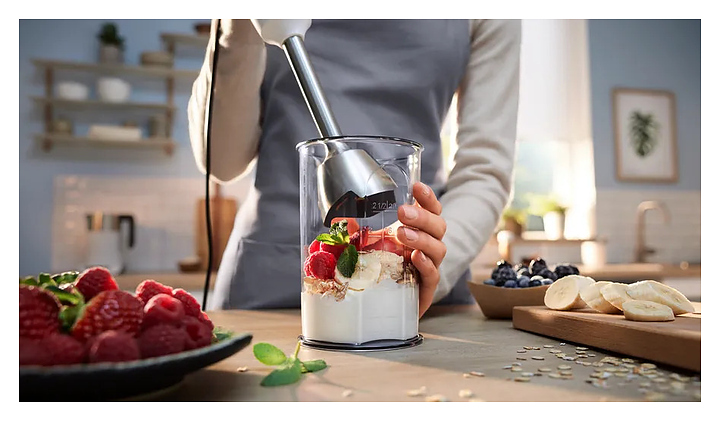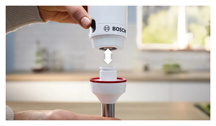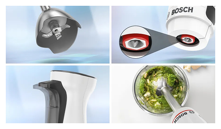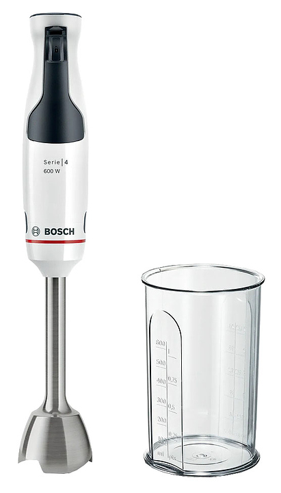 Погружной блендер Bosch MSM4W210 серии ErgoMaster предназначен для взбивания жидкого теста, кремов и коктейлей, измельчения фруктов, овощей, орехов и трав, а также приготовления соусов и супов-пюре в домашних условиях. Модель оснащена ножом с 4 лезвиями, ручкой, кнопками и бесступенчатой регулировкой скорости. Турбо-режим обеспечивает максимальную мощность за короткое время для быстрого измельчения твердых продуктов и приготовления однородных смесей, коктейлей и пюре. Съемные детали можно мыть в посудомоечной машине. Корпус и стакан из пластика, погружная часть - из металла. В комплект поставки входят мерный стакан и вакуумный насос. Дополнительные характеристики: