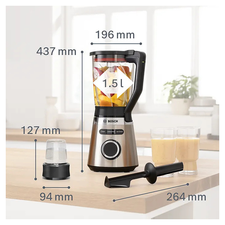 Стационарный блендер Bosch MMB6386M серии VitaPower предназначен для измельчения фруктов, овощей и трав, а также приготовления соусов, смузи и супов-пюре в домашних условиях. Модель оснащена ножом с 4 лезвиями, бесступенчаной регулировкой скорости, кнопками и поворотным переключателем. Турбо-режим обеспечивает максимальную мощность за короткое время для быстрого измельчения твердых продуктов и приготовления однородных смесей, коктейлей и пюре. Съемные детали можно мыть в посудомоечной машине. Кувшин выполнен из стекла. Дополнительные характеристики:
