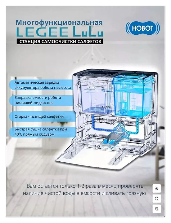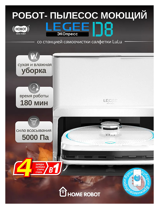 Робот пылесос моющий Hobot Legee-D8 со станцией самоочистки эффективно очищает как сухие полы, так и ковры, идеально подходит семьям, ценящим гигиену и простоту, он справляется с пылью и остатками пищи, продлевая свежесть напольных покрытий. Модель оснащена автоматической очисткой, регулировкой мощности и парковкой пылесоса. Корпус изготовлен из прочного пластика. В комплект поставки входят робот-пылесос моющий LEGEE-D8, зарядная станция, сетевой адаптер, бутылочка для налива воды, салфетки из микрофибры Ag+ion (2 шт.), распыляющие сопла (4 шт.), боковые щетки (3 шт.), воздушный фильтр HEPA моющийся (1 шт.), инструмент для чистки и инструкция, станция LEGEE LuLu, платформа, кабель питания, TDS-метр, инструкция и гарантийный талон. Особенности: